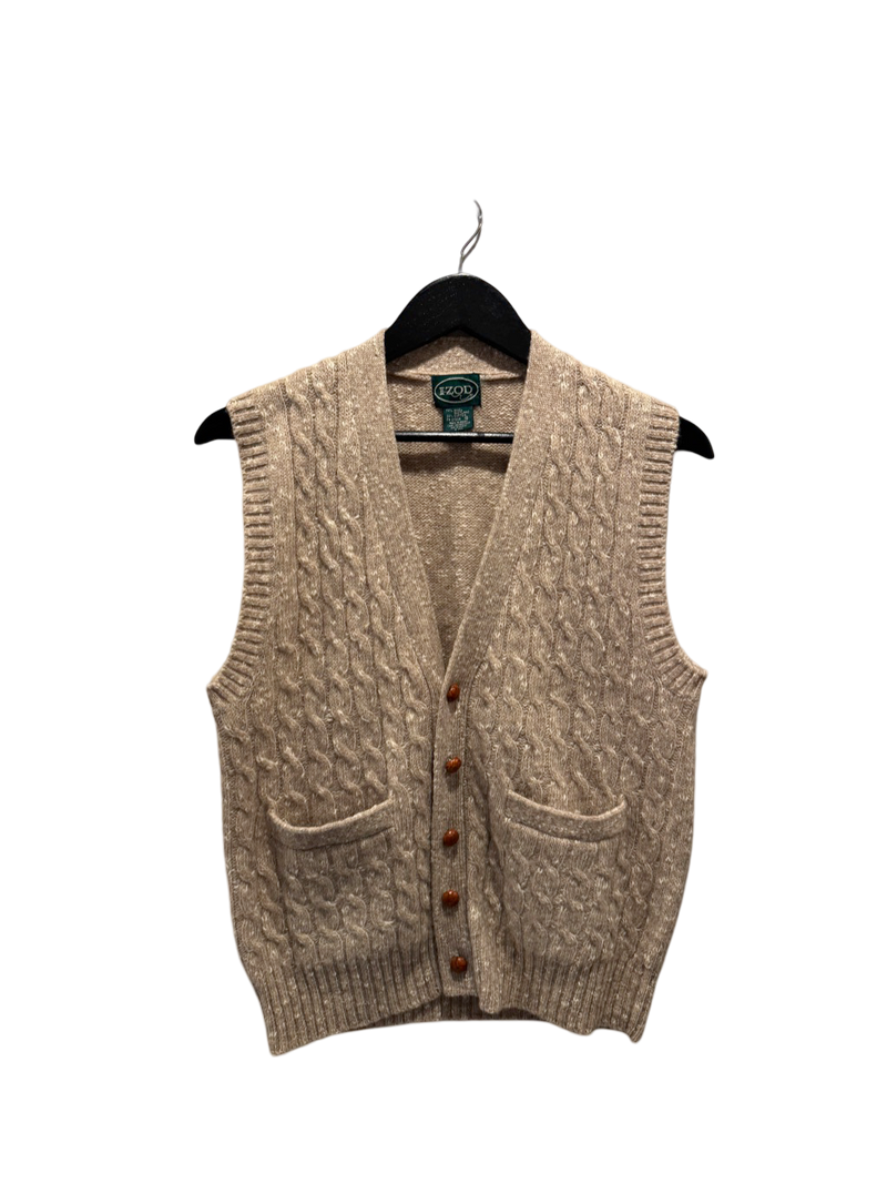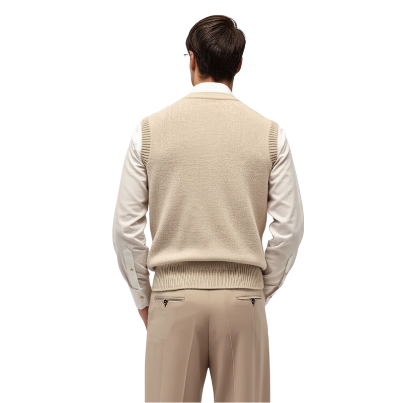 1960s Cambridge Cable-Knit Vest – a classic wool vest with intricate cable-knit detailing, embodying the refined intellectualism of Ivy League heritage and European academia.