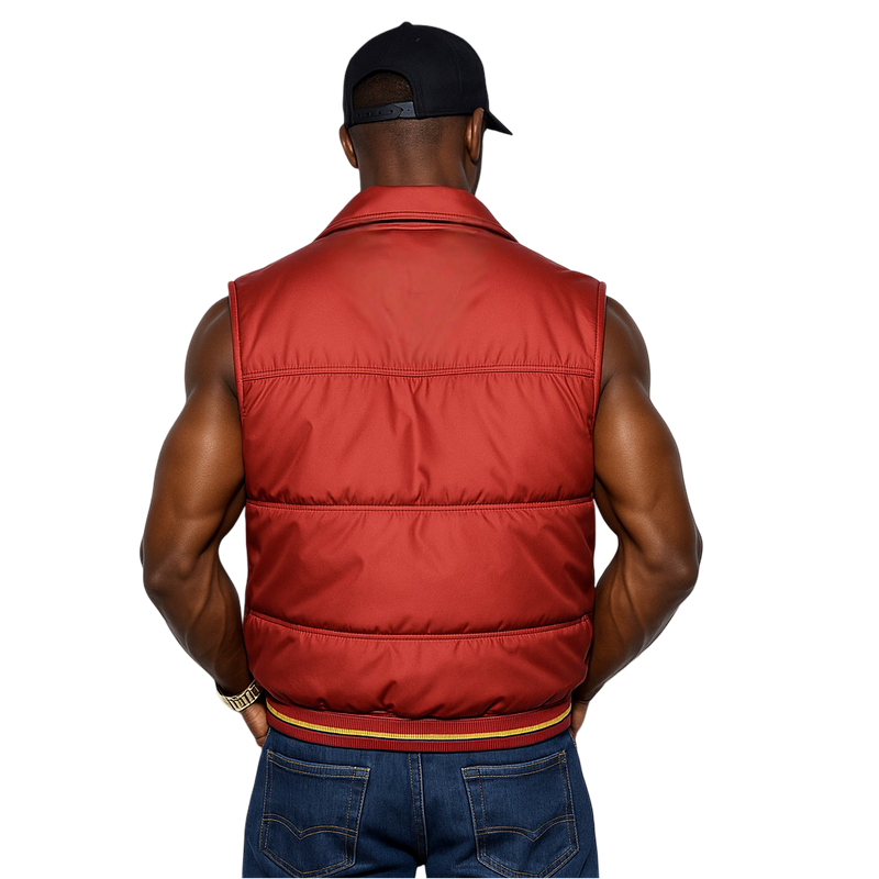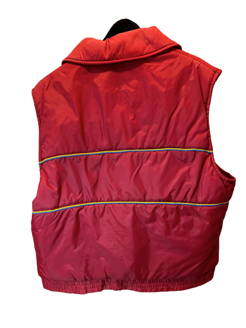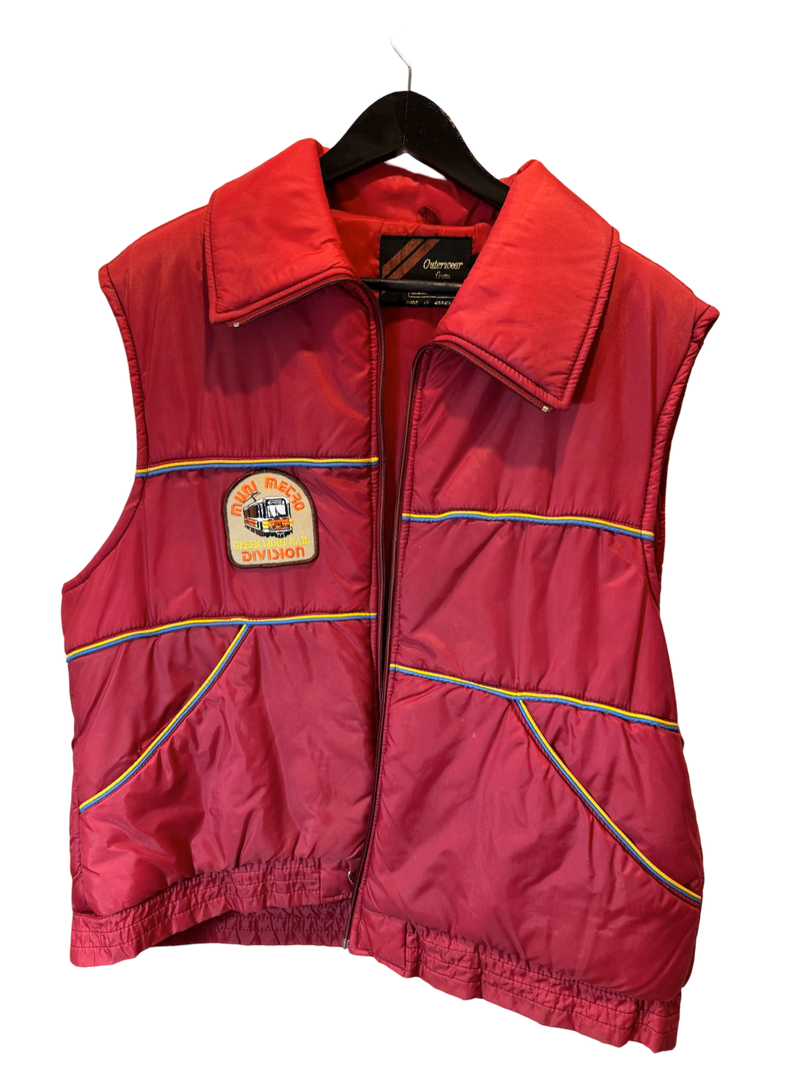Muni Metro Vest – a fire-red 1990s puffer vest with SF transit drip and rainbow piping that popped like graffiti on a subway car in a Nas video.