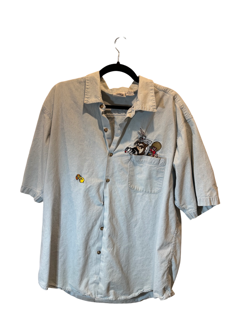 Looney Denim Drop Shirt – this faded 90s button-down with full Looney Tunes embroidery brings Saturday morning chaos to grunge-era cool with zero apologies.