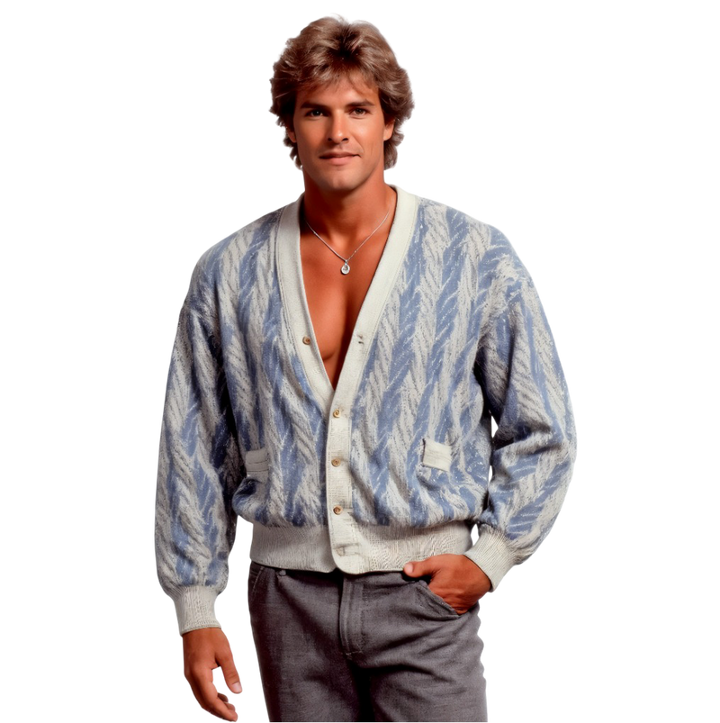 Ziggy Stardust Cardigan – a lightning-bolt knit straight from the 1970s, echoing glam rock rebellion and Bowie-inspired studio energy.