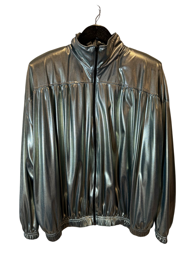 Xanadu Mirror Jacket – this high-shine 1980s silver zip-up glows like a disco ball under the lights, echoing the roller-boogie glamour of cult film fantasies and dancefloor dreams.