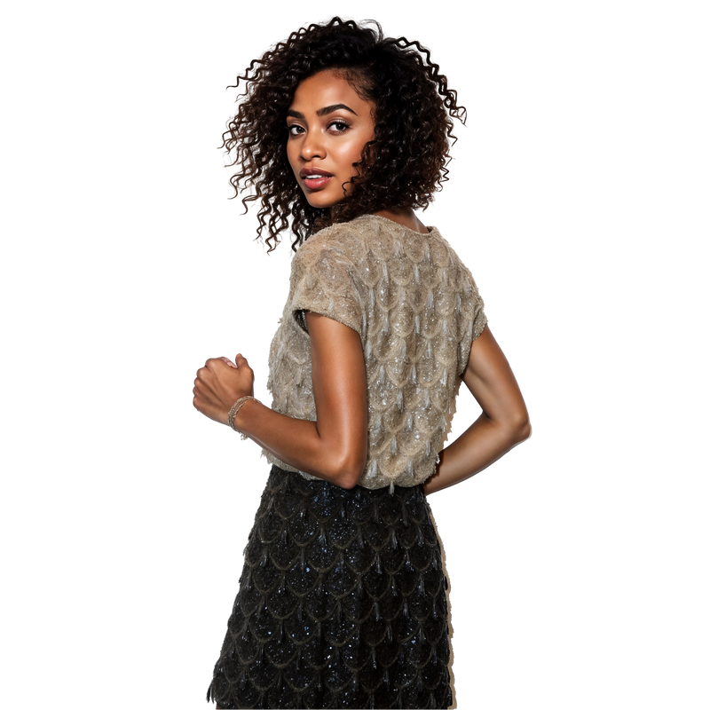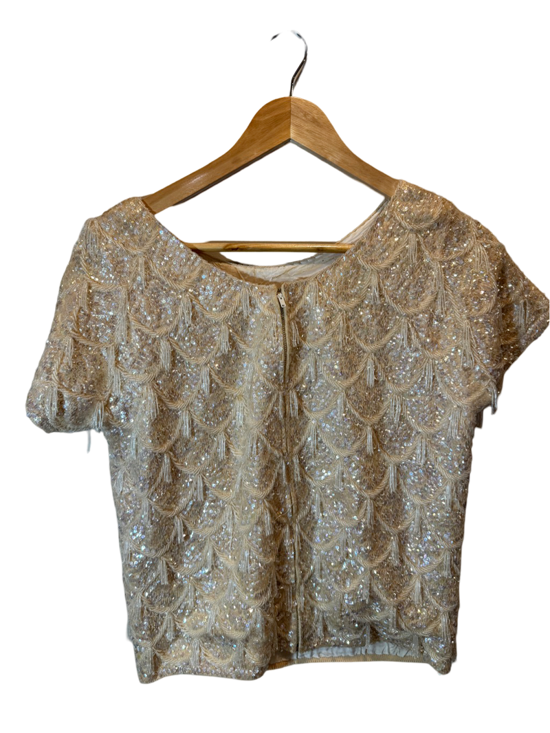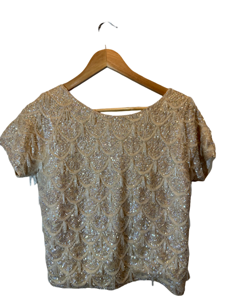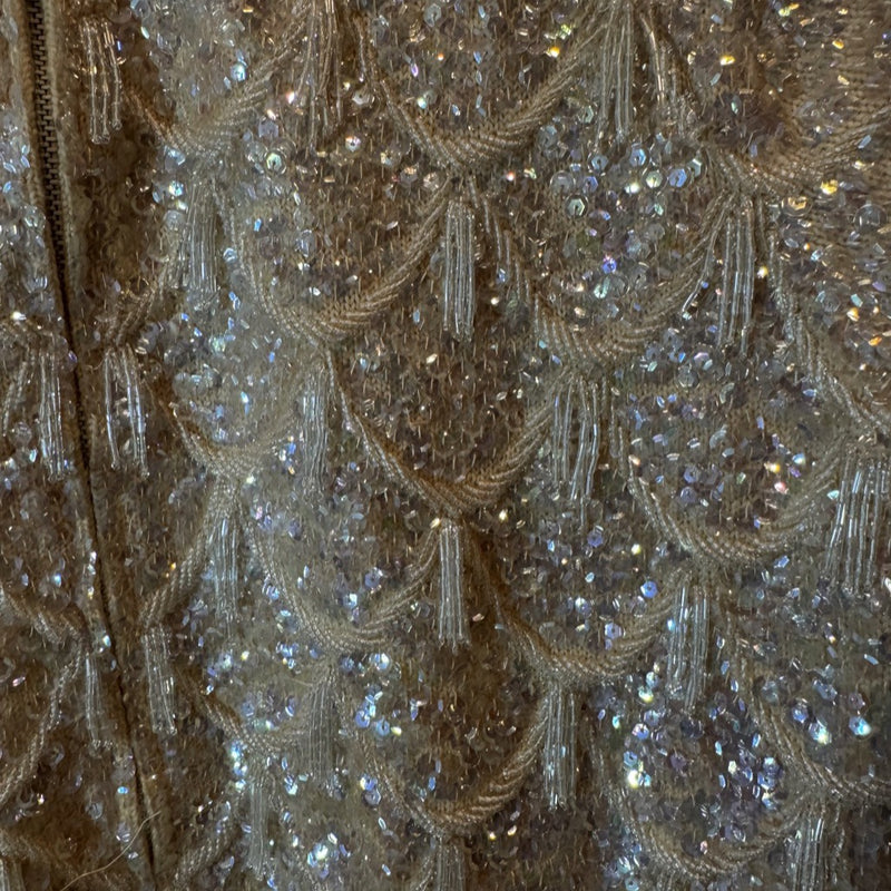 Likely a silk blend with hand-sewn sequins and beadwork. Sourced and revived in the USA.