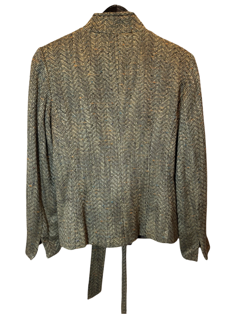 Oscar de la Renta Belted Jacket – a sculpted tweed wrap jacket from the 1970s, ideal for first-class arrivals at alpine resorts and fireside champagne at après-ski lounges.
