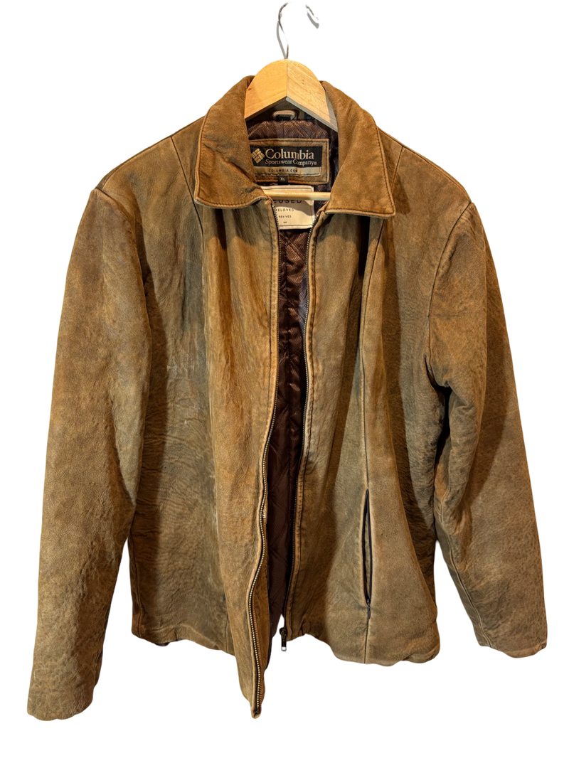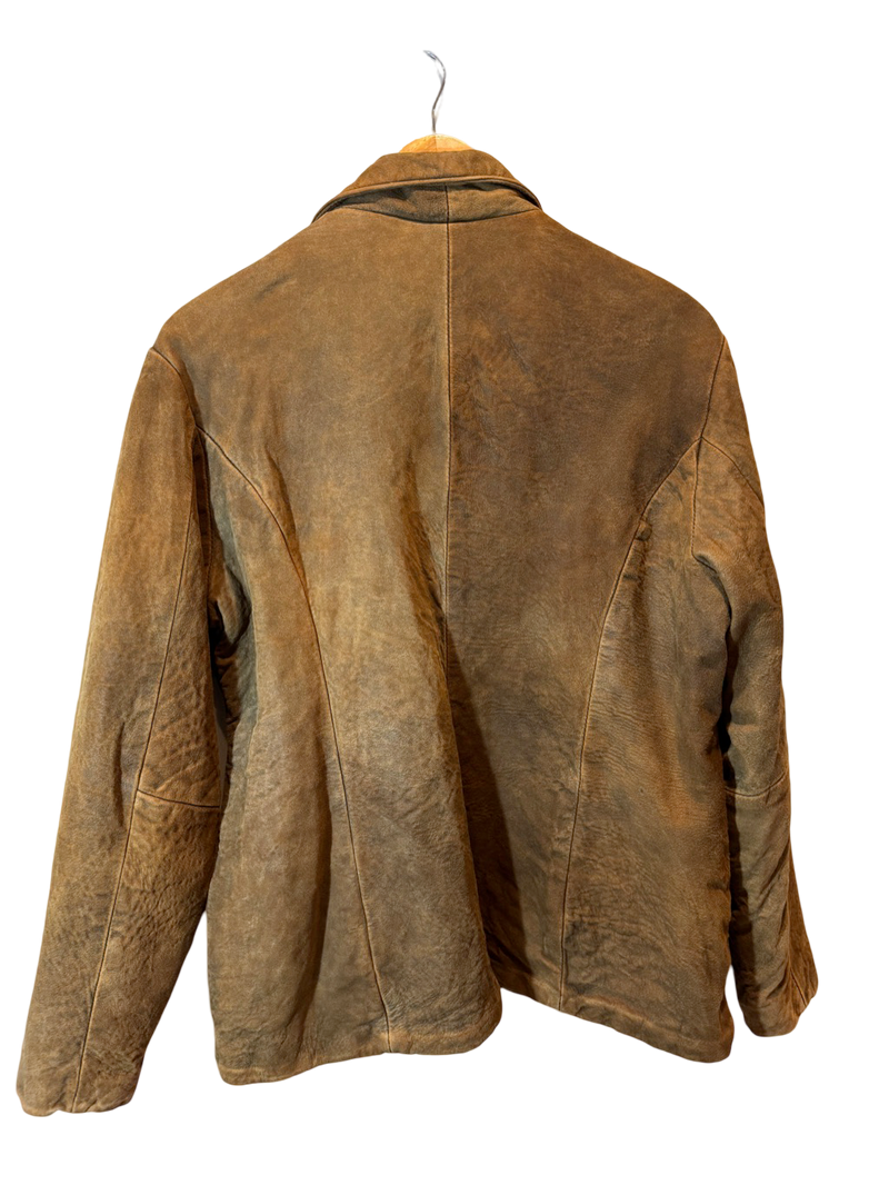 Likely genuine distressed suede leather with quilted synthetic lining. Sourced and revived in the USA.