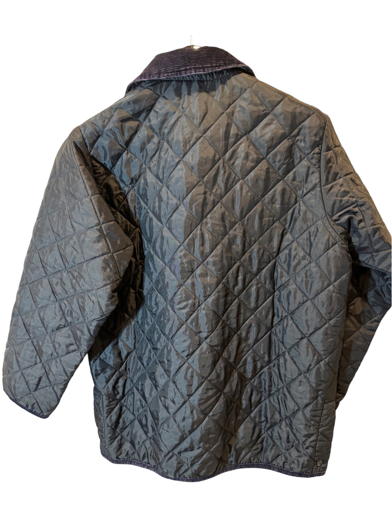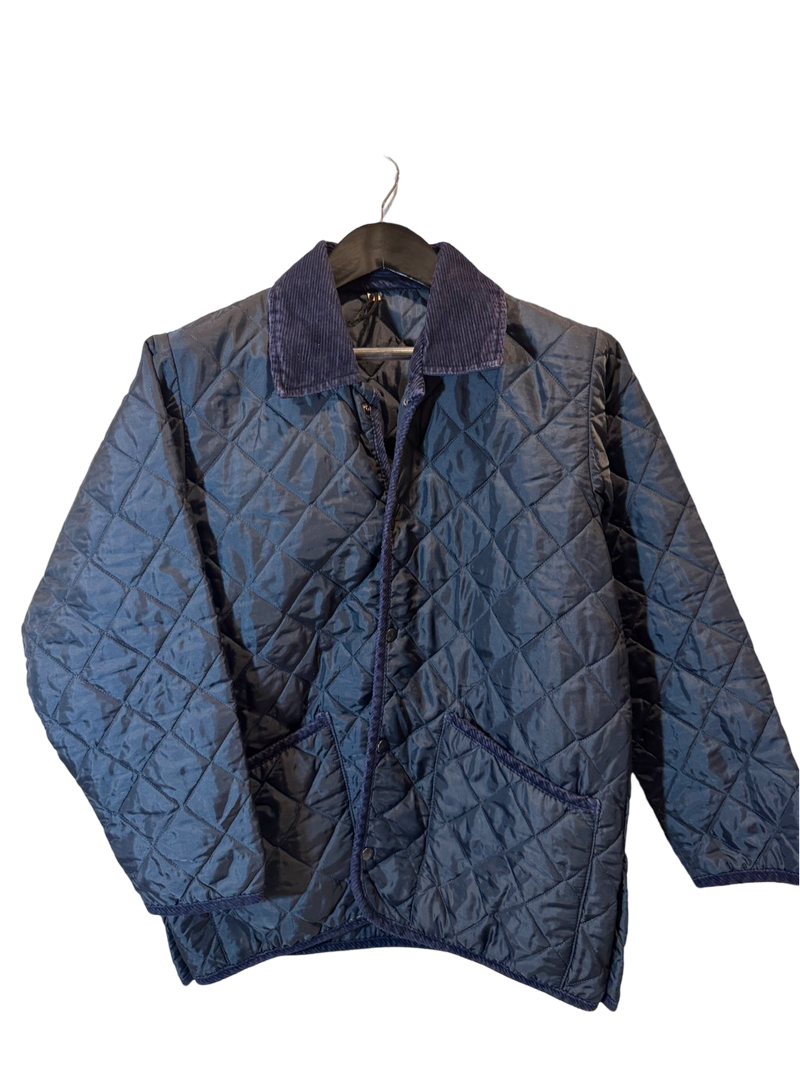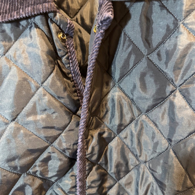 Oxford Lot Jacket – a quilted navy snap-front coat with corduroy collar from the 1970s, straight off the lot between takes and quick rewrites.