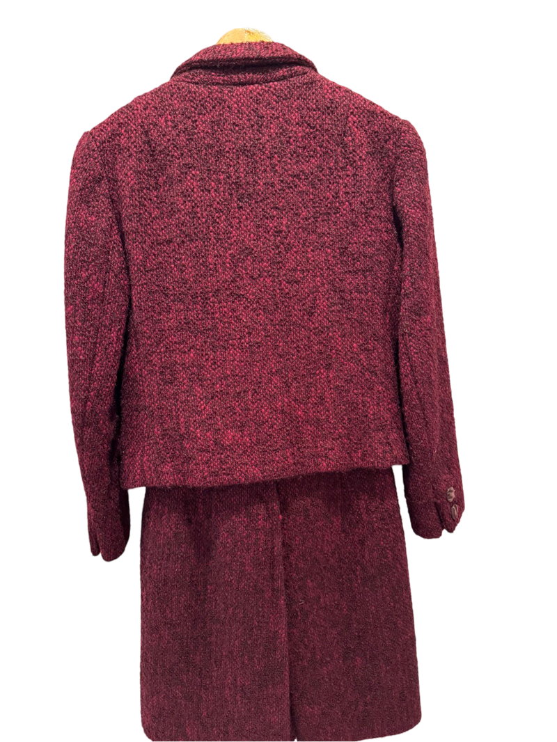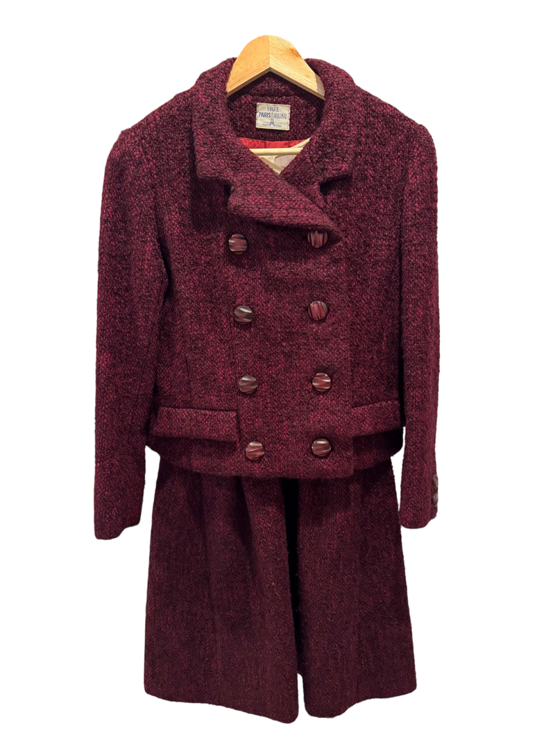 1960s Vogue Paris Tweed Suit – a sophisticated double-breasted wool suit in a deep burgundy hue, embodying the elegance of 1960s European fashion icons.