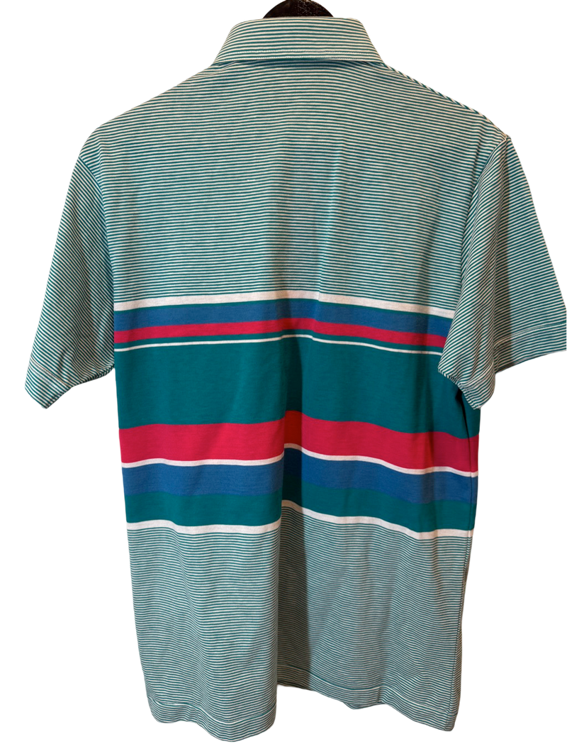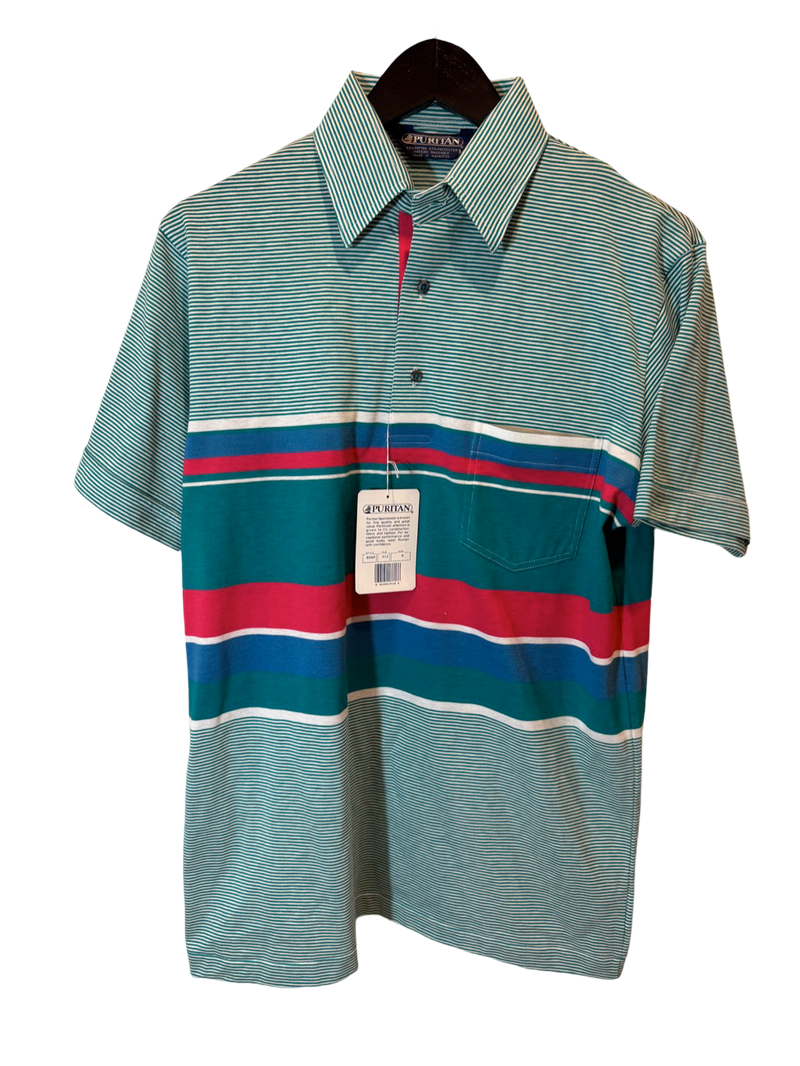 Puritan Arcade Hero Polo – 1980s striped polo in punchy teal, red, and cobalt, made for mall nights, joystick battles, and back-alley breakouts after curfew.