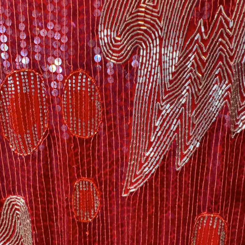 Likely a polyester or silk blend with hand-sewn beading and sequins. Sourced and revived in the USA.