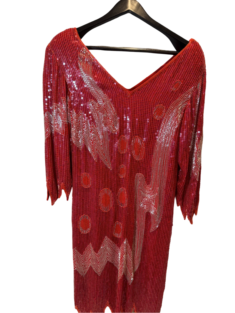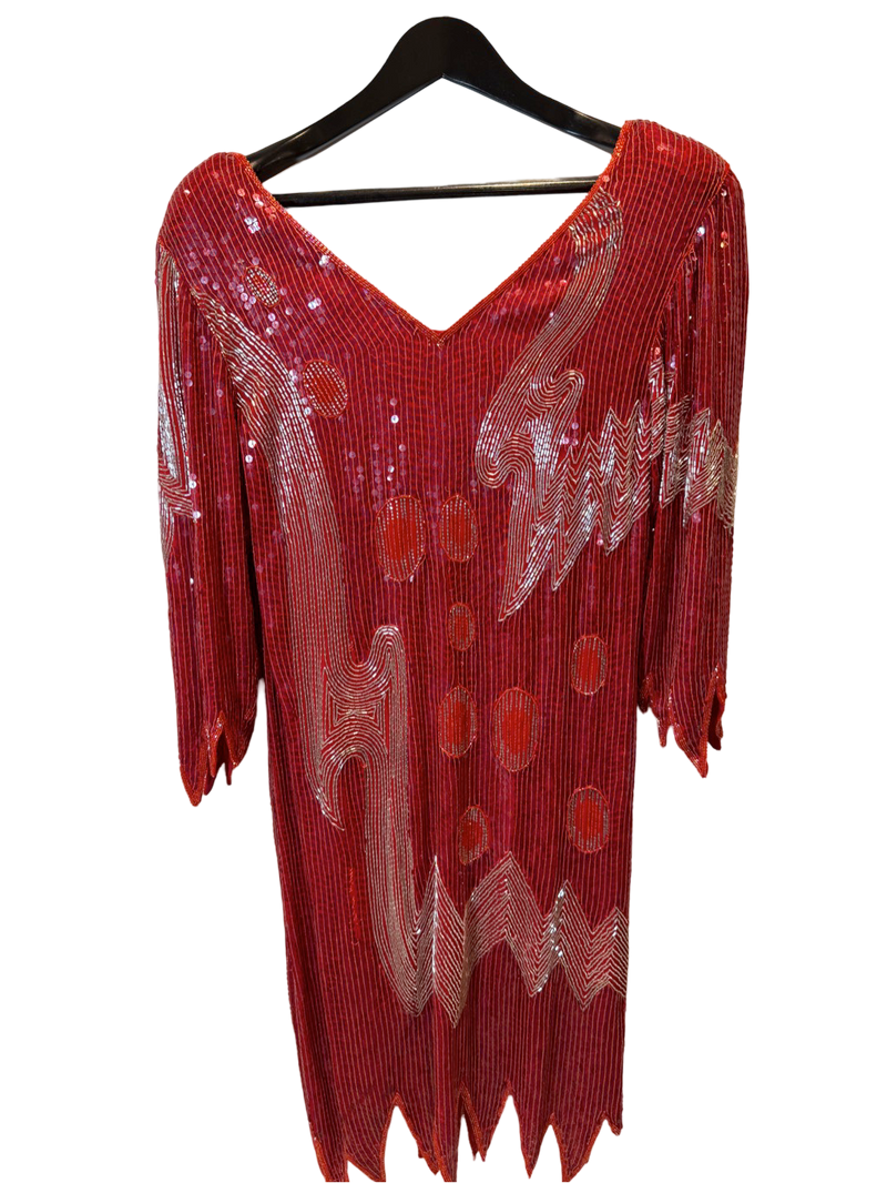 Solid Gold Sequin Dress – a dazzling 1980s red-and-silver beaded stunner with lightning patterns, straight off the dance floors of late-night TV and glimmering club sets.
