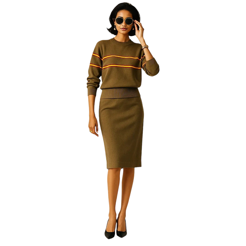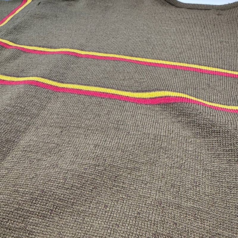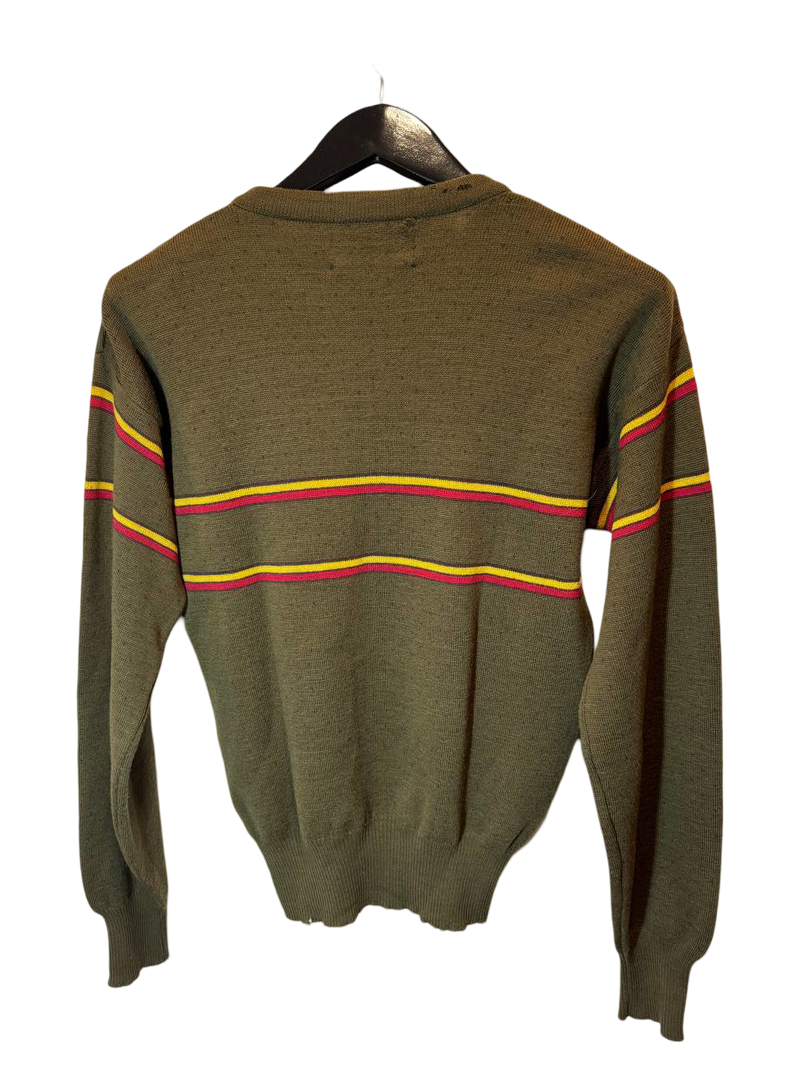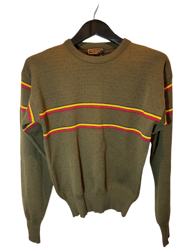 YSL Sweater – a 1970s olive wool pullover with bold stripes, reminiscent of in-transit style spotted at Charles de Gaulle between flights to Marrakesh and Madrid.
