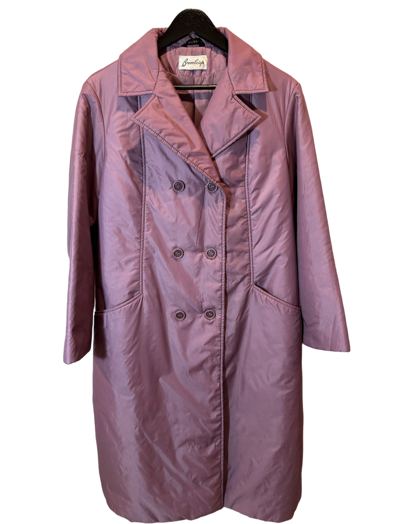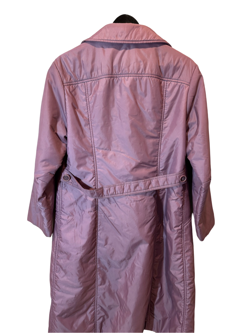 Monte Carlo Mist Coat – a mauve satin trench from the jet-set 1970s, made for rainy strolls along the Riviera or brisk boarding calls in Nice.