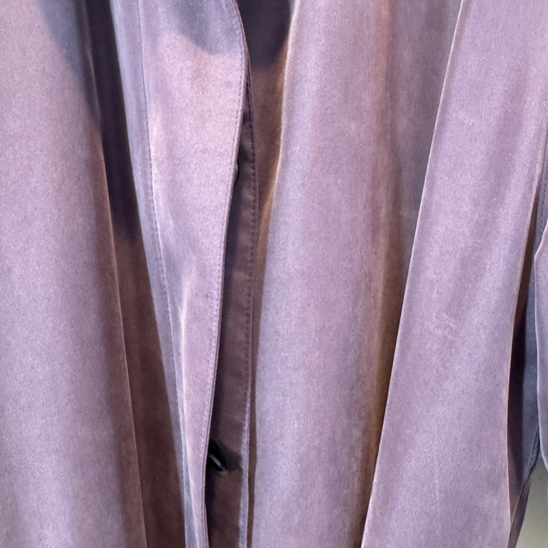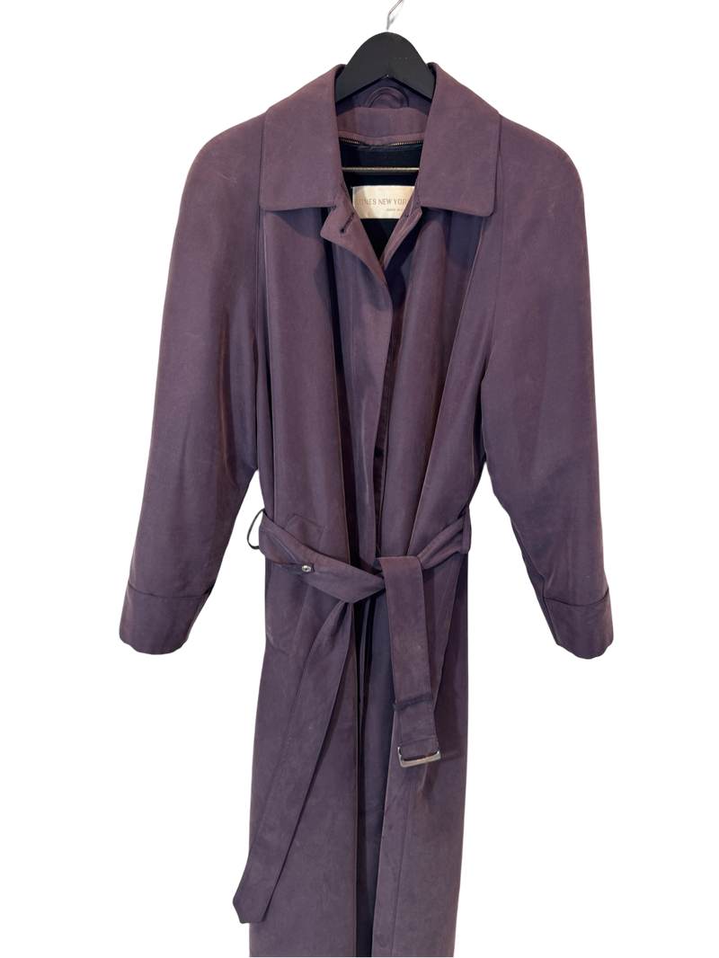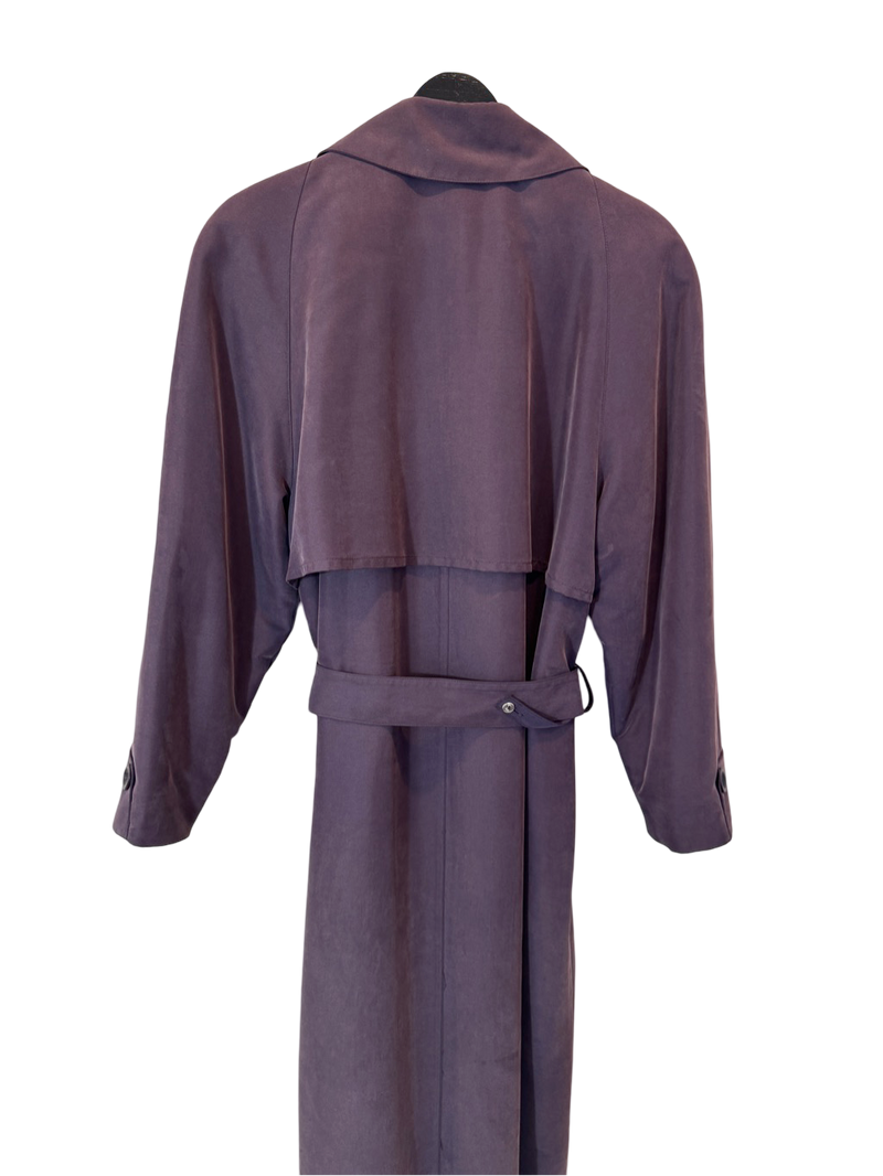 Dynasty Velvet Trench – a plum-hued 1980s belted coat in luxe velvet, serving serious shoulder-pad energy and soap opera sophistication.