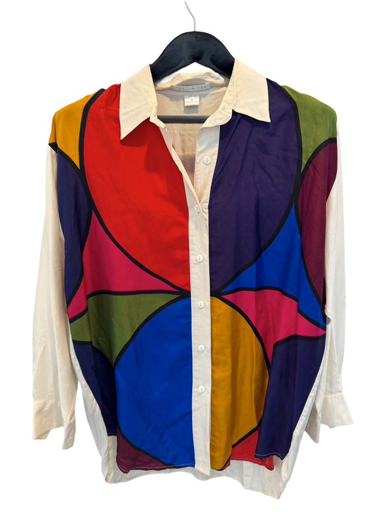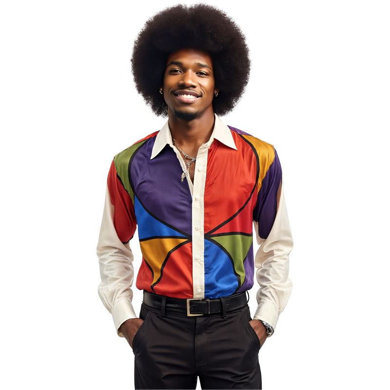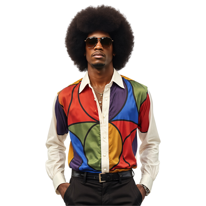 Solid Gold Sunrise Shirt – a bold 1980s button-up exploding with stained-glass colorblocking, perfect for spinning under club lights or weekend roller rinks.