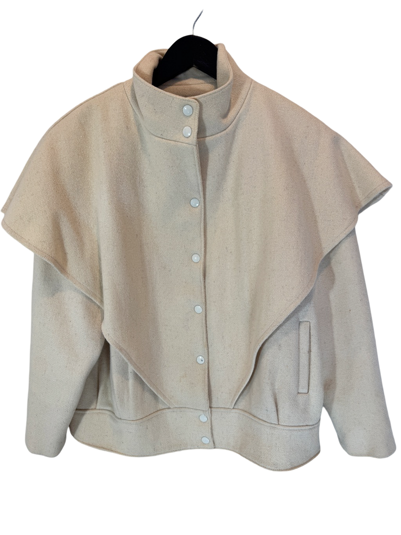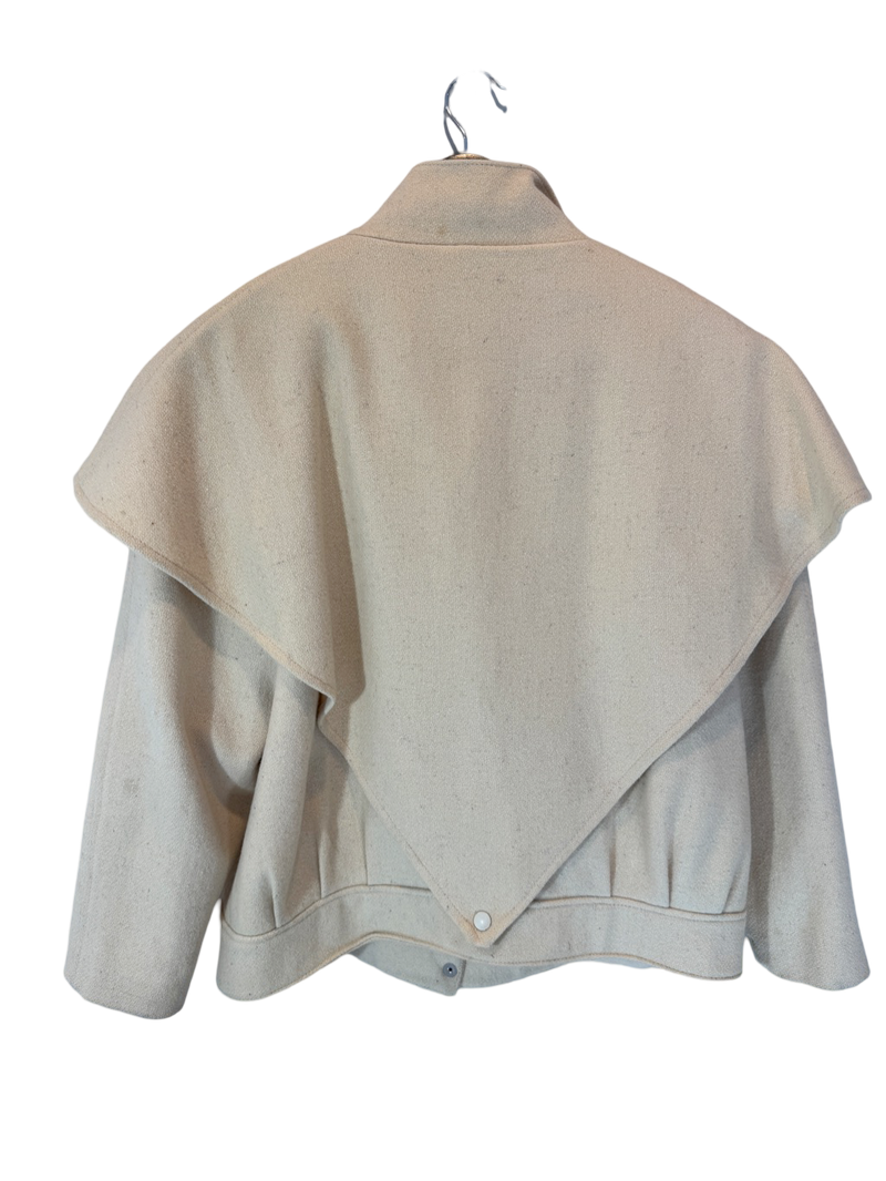 St. Tropez Cape Jacket – a sculptural 1970s wool-blend jacket with dramatic cape drape, reminiscent of high-society resortwear along the French Riviera.