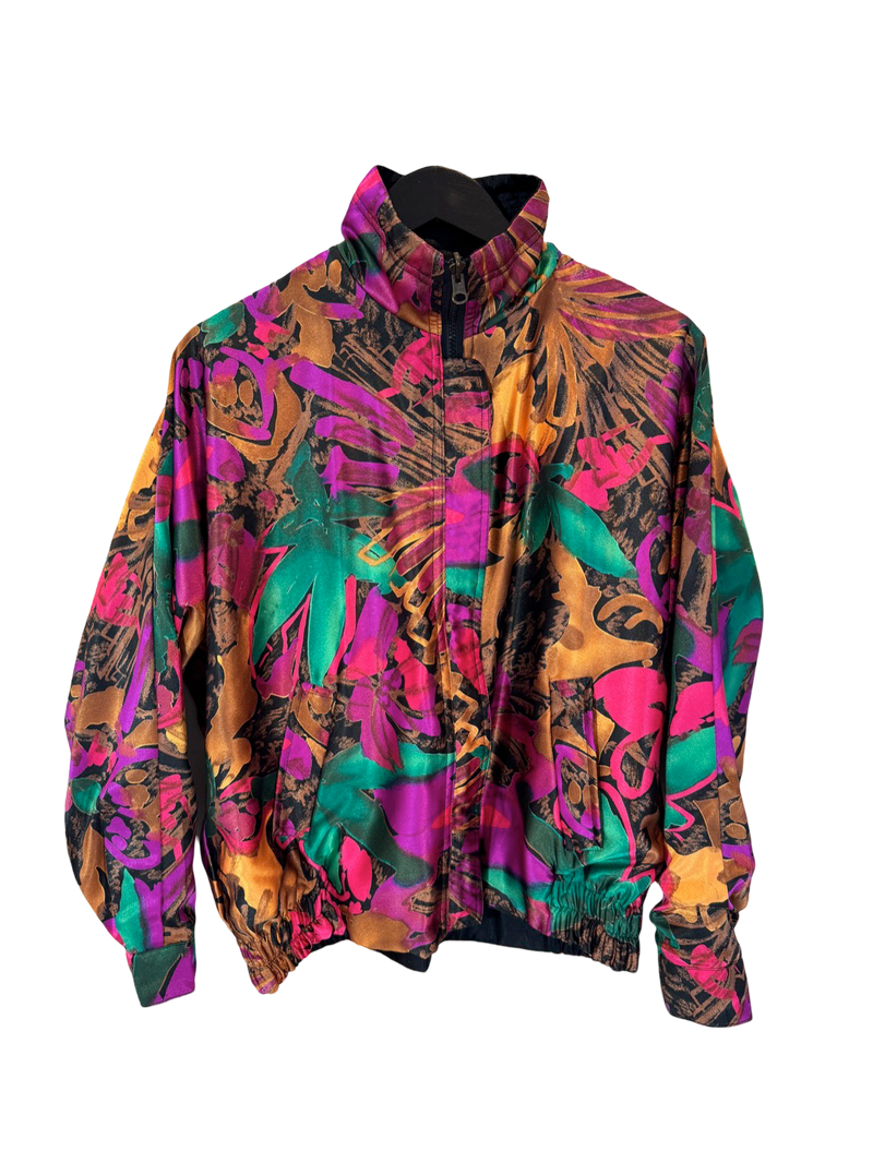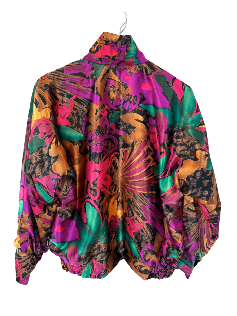 Beverly Hills Jungle Jacket – a wild 1990s satin bomber splashed in electric florals, echoing the bold prints of fashion editorials and supermodel off-duty looks.
