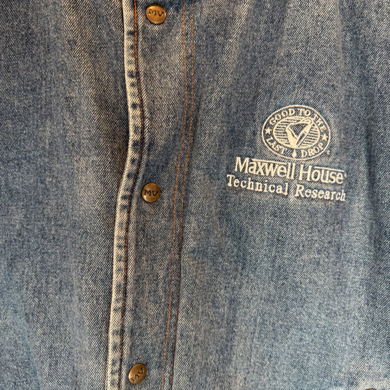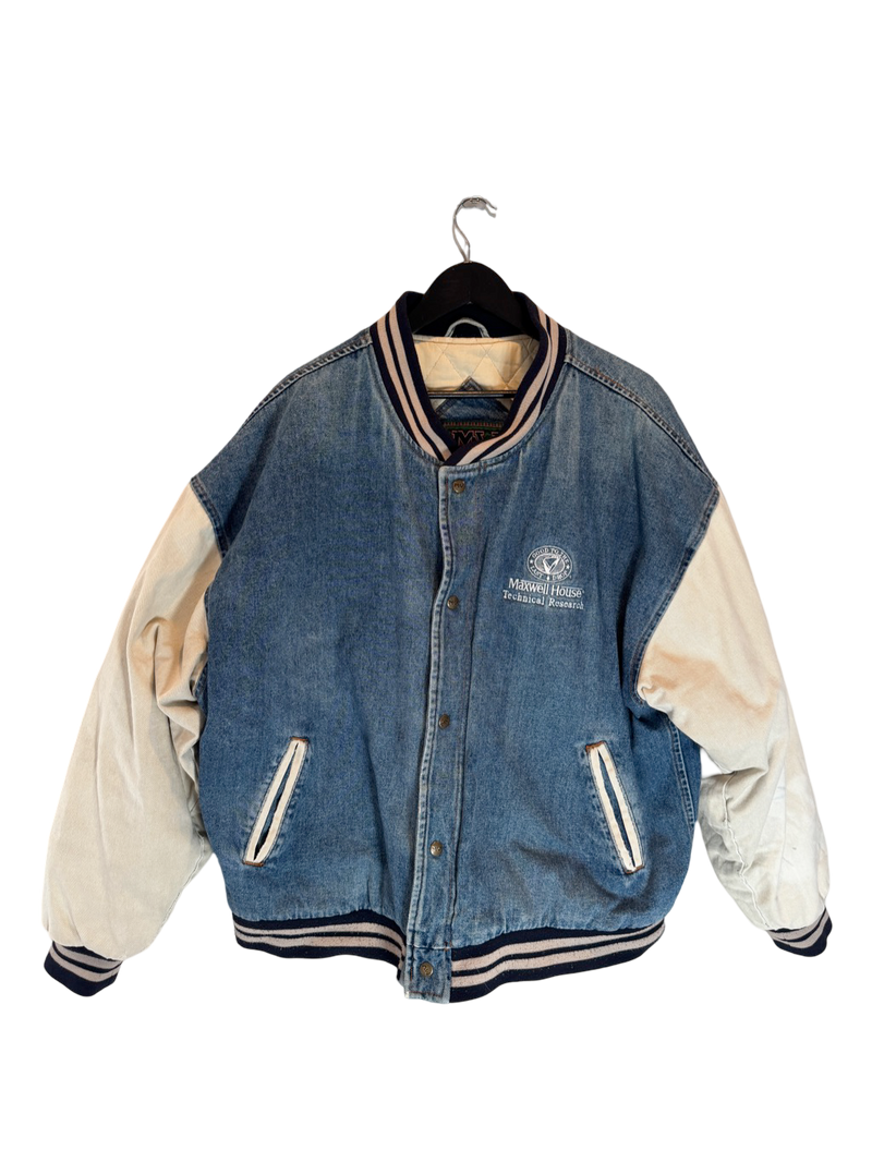 Rap City Denim Varsity – a 1990s two-tone denim varsity jacket with Maxwell House embroidery, steeped in the era of branded streetwear and BET music video rotations.