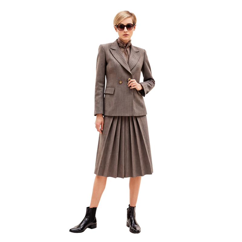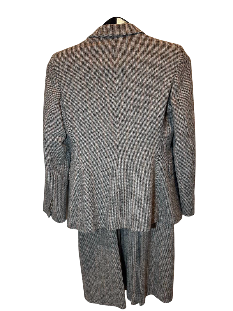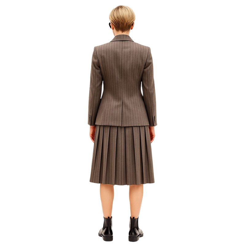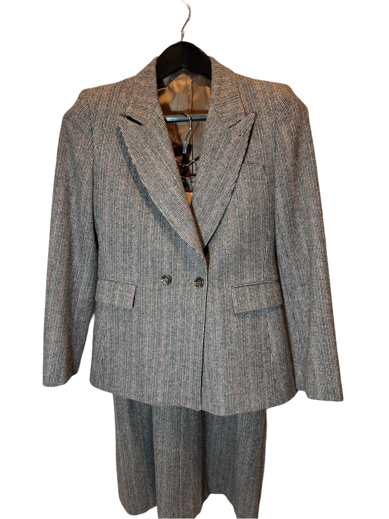 Hotel Bristol Power Suit – a sharply tailored 1970s skirt suit in classic tweed, designed for sealing deals over caviar and commanding lobbies from Paris to Zurich.