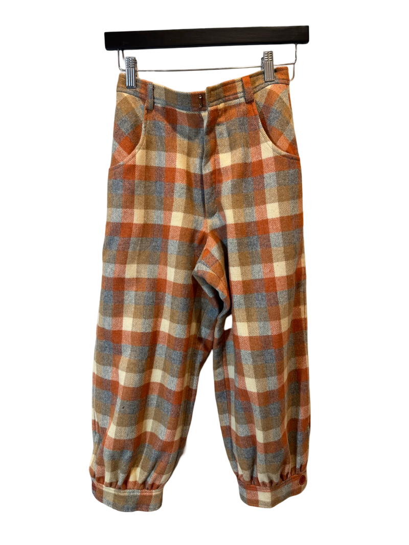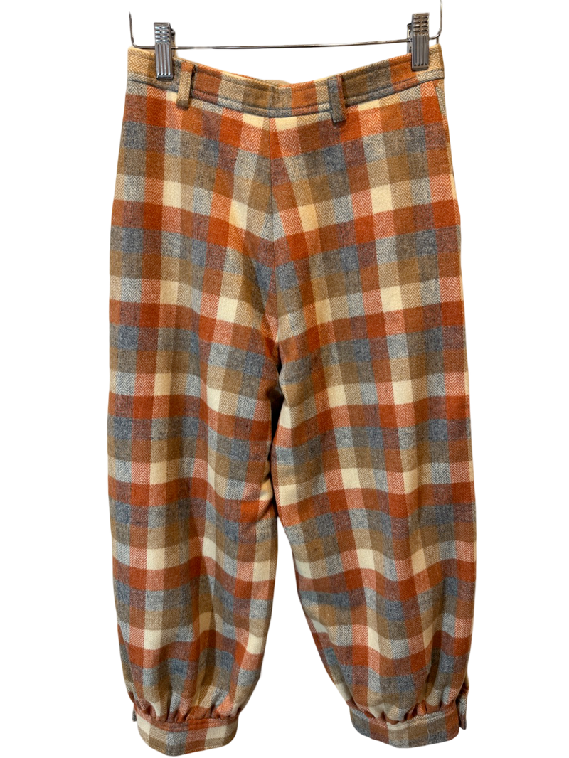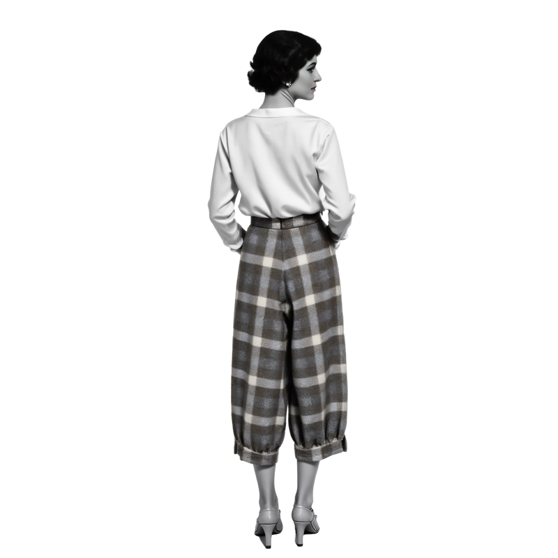 WPA Plaid Knickers – cropped wool trousers in a vibrant herringbone plaid, worn for fieldwork, radio duty, or afternoons at the typing pool with sleeves rolled up.