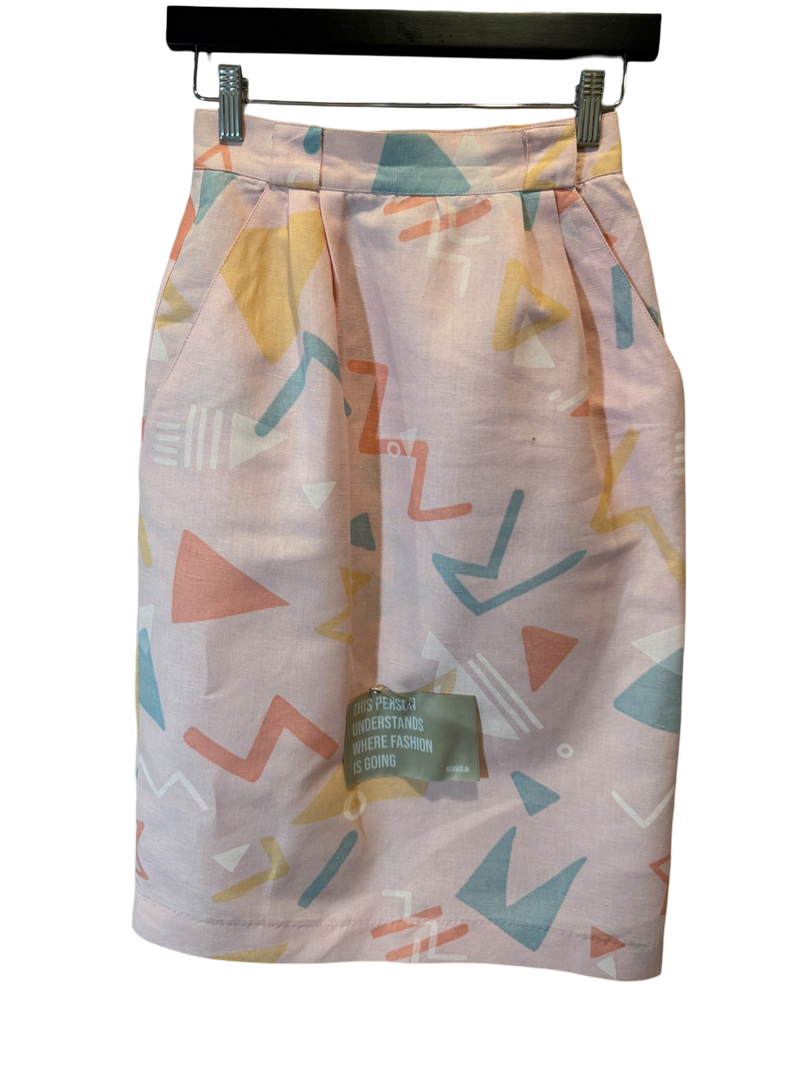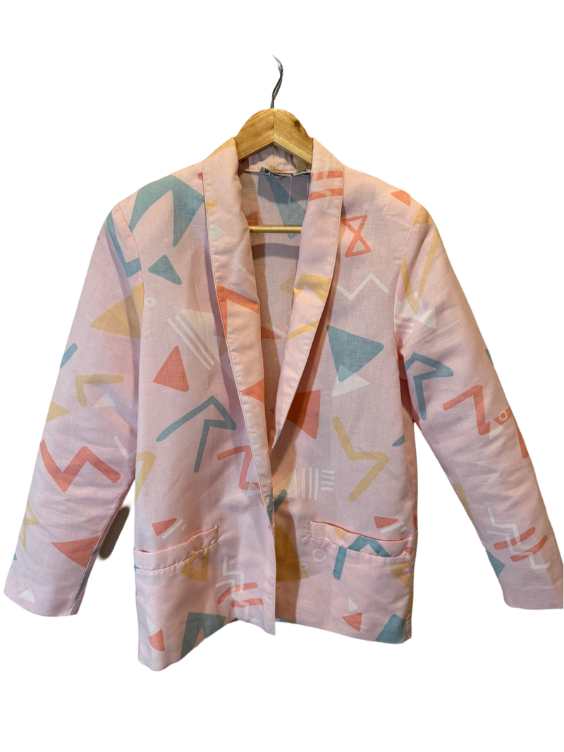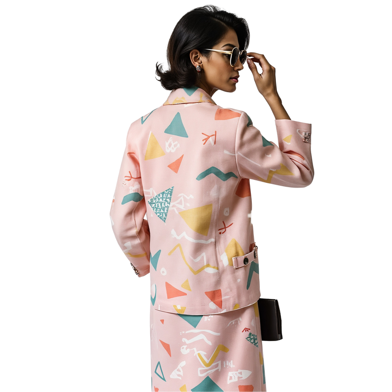 Jet Set Memphis Suit – a playful 1970s skirt and blazer set in pastel mod geometrics, nodding to the bold graphic design that took over boutique hotels and Riviera lounges.