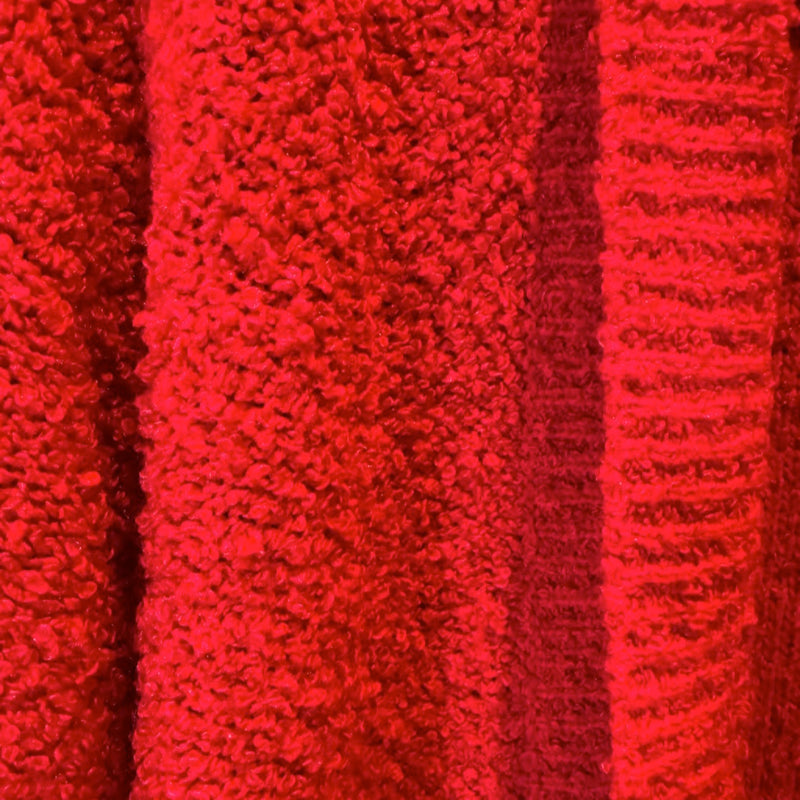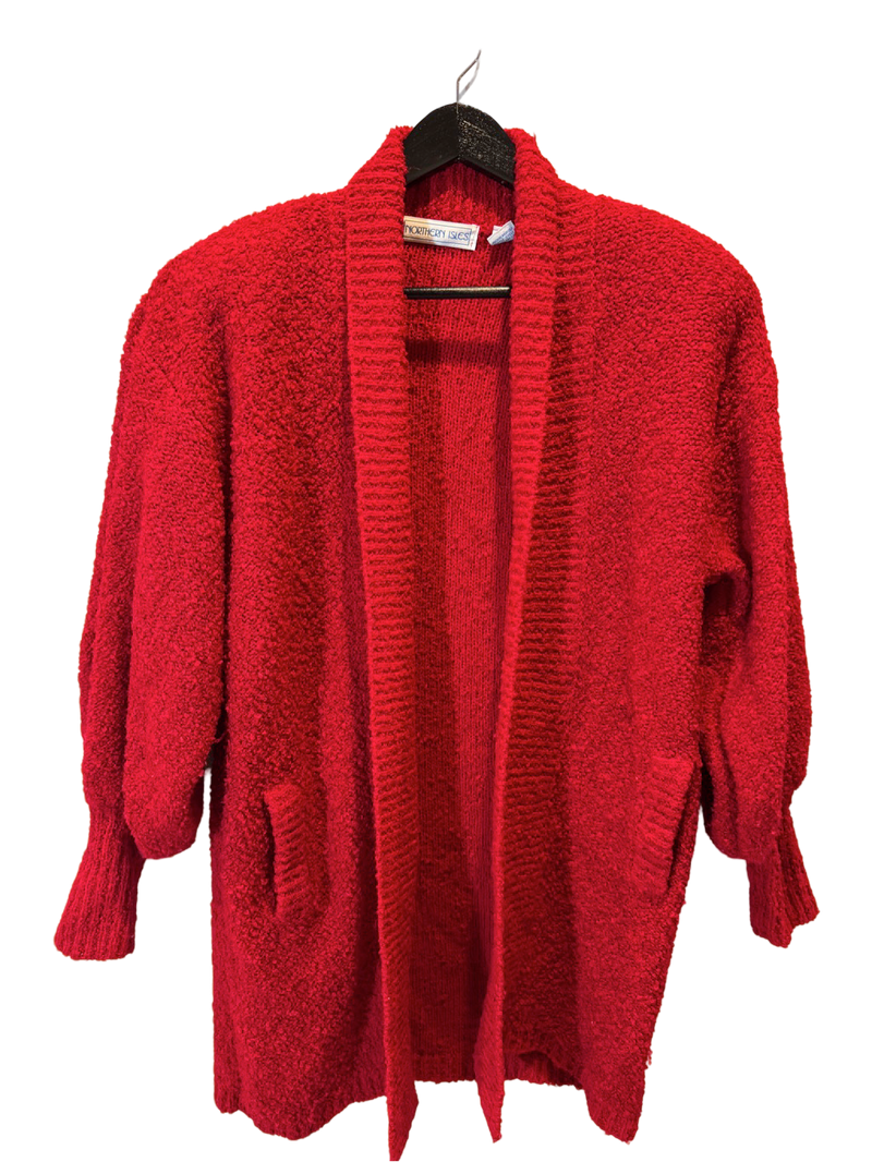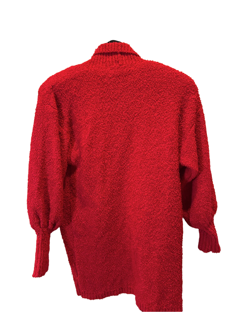 Dynasty Office Cardigan – a powerfully plush red boucle knit from the 1980s, channeling boardroom drama and soap opera sophistication with every oversized stitch.