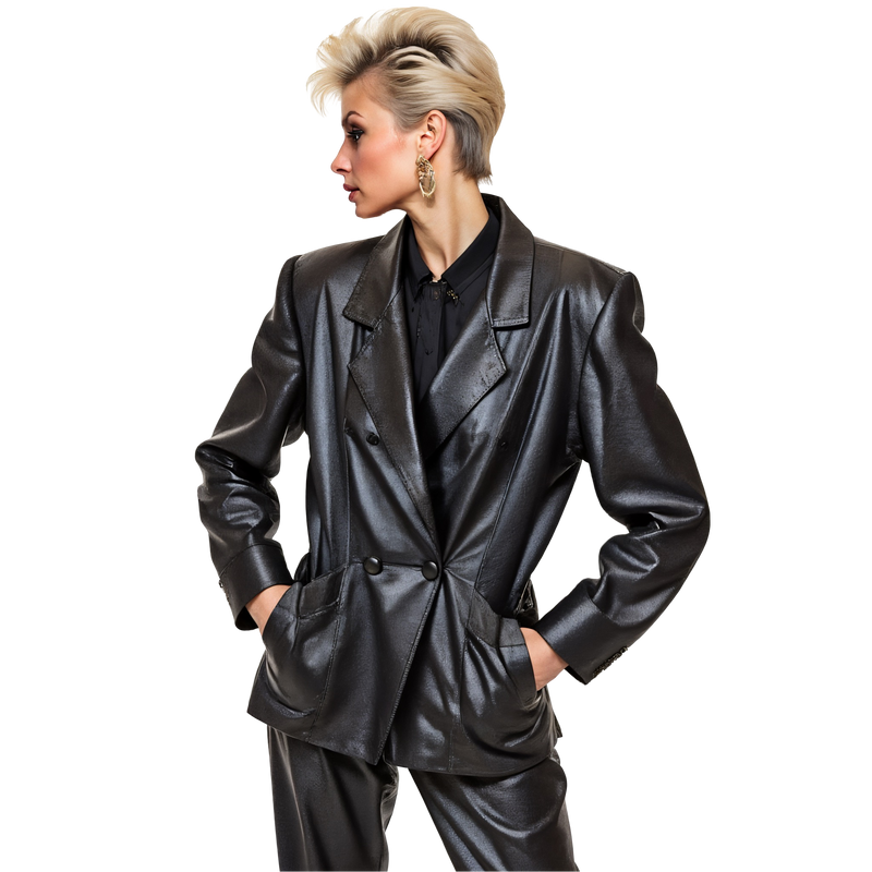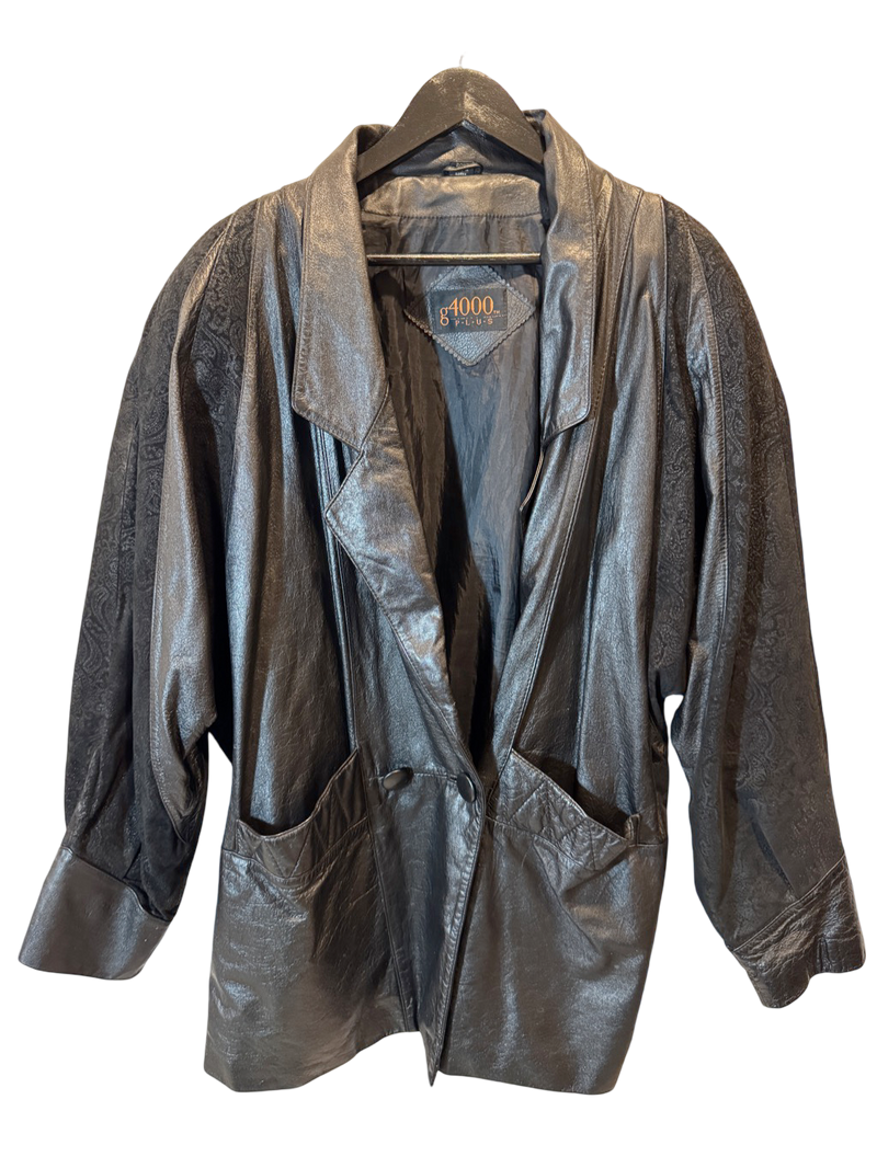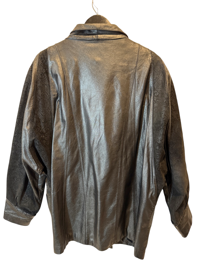 Wall Street Paisley Jacket – a commanding black faux leather blazer from the 1980s, embossed with subtle paisley detailing that whispered power in every corner office.