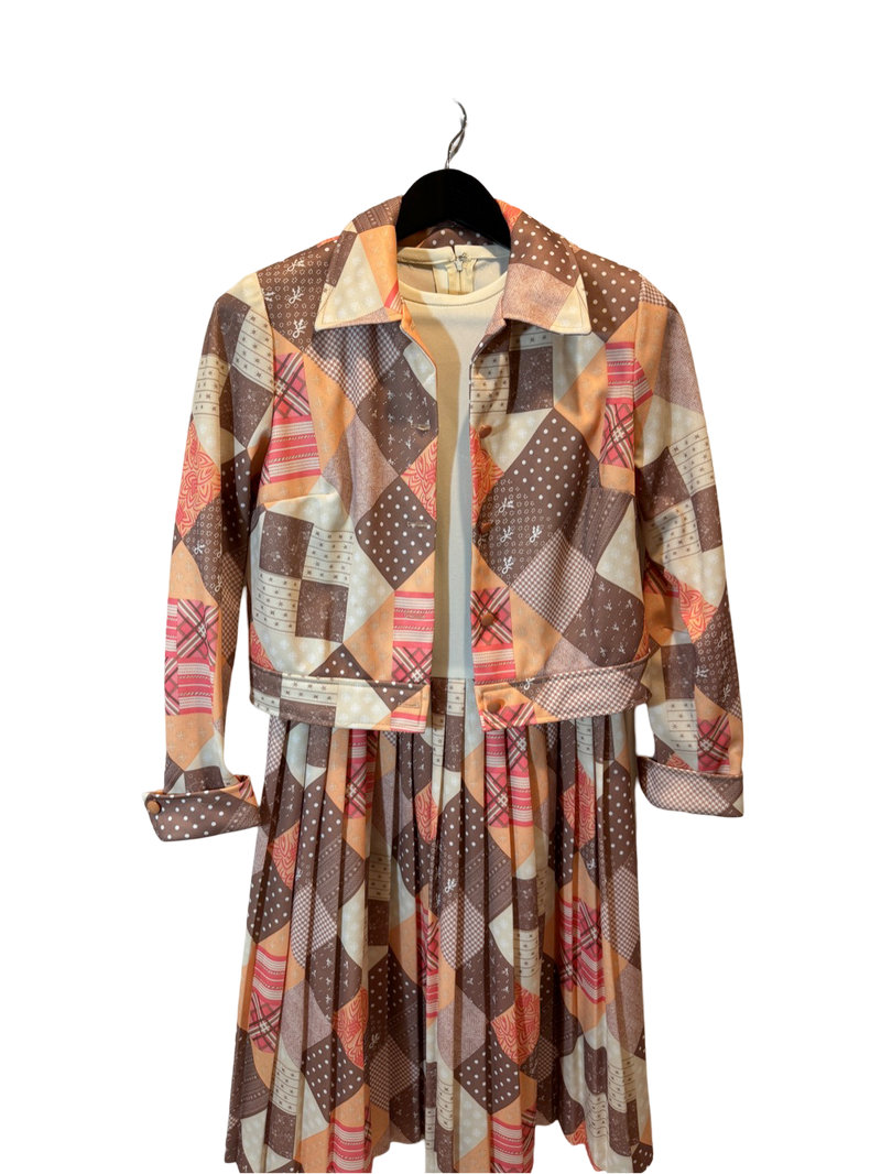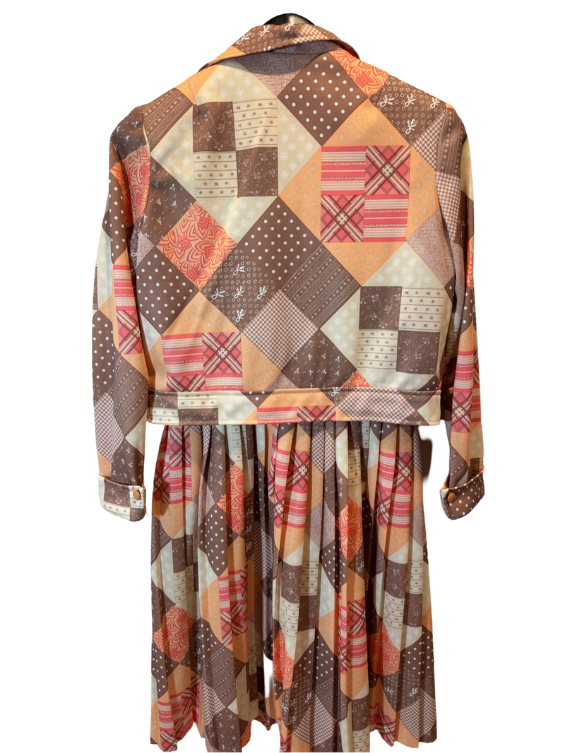 Pleasantville Patchwork Set – a cheerful coordinated jacket and skirt set from the 1960s, patterned in faux-quilt prints perfect for bake-offs, school fundraisers, and civic fairs.