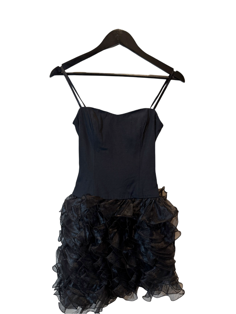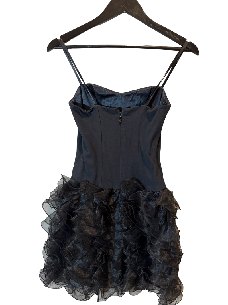 Likely polyester with layered organza ruffles. Sourced and revived in the USA.
