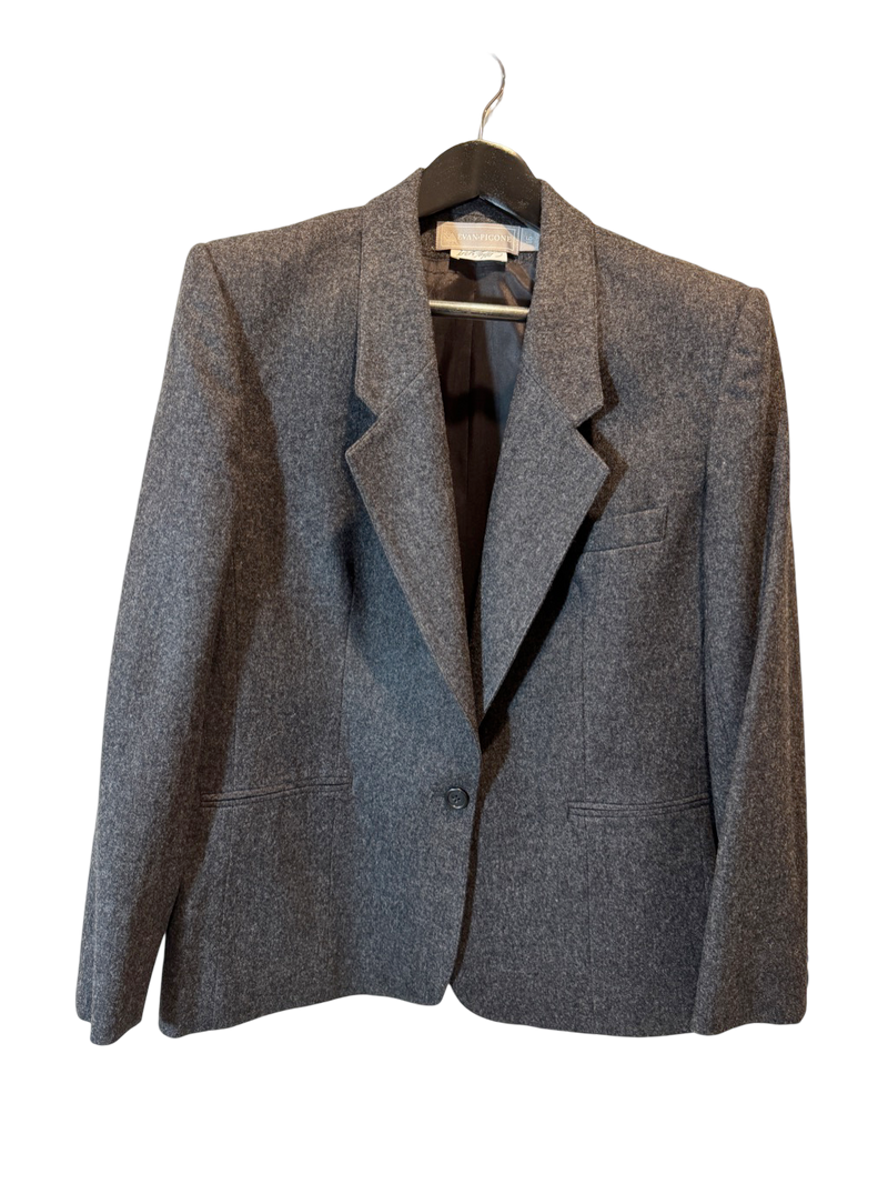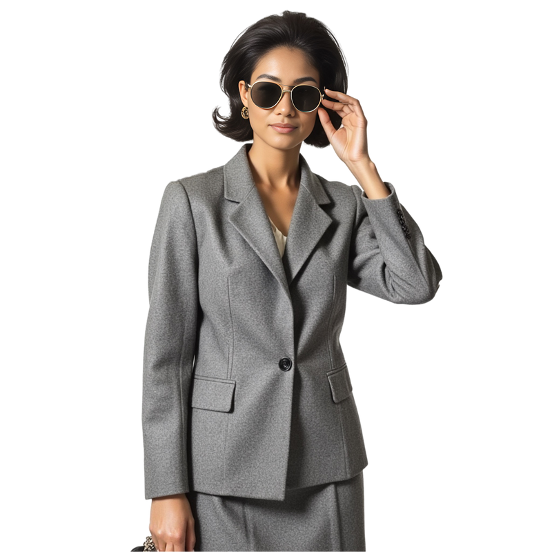 Concorde Boardroom Set – a structured 1970s wool blazer and skirt combo, echoing the jet-set business chic seen in airport lounges and transatlantic meetings of the era.