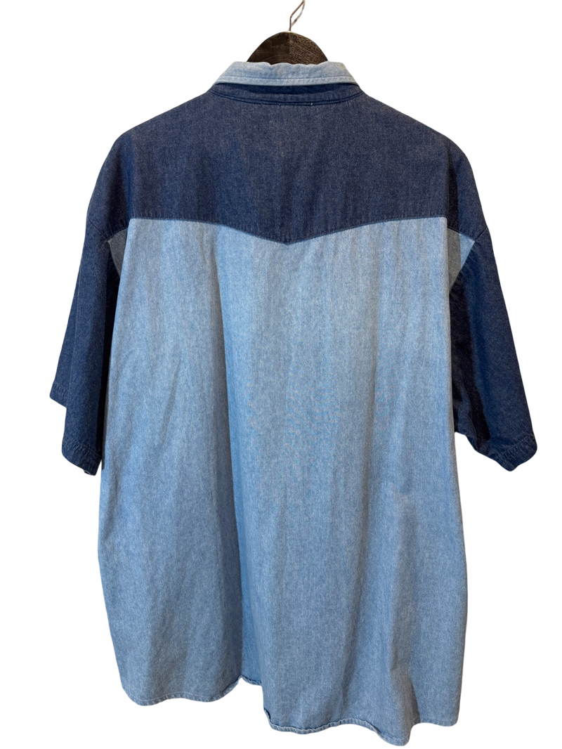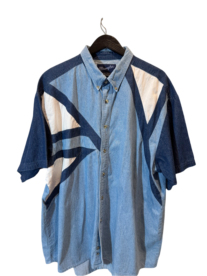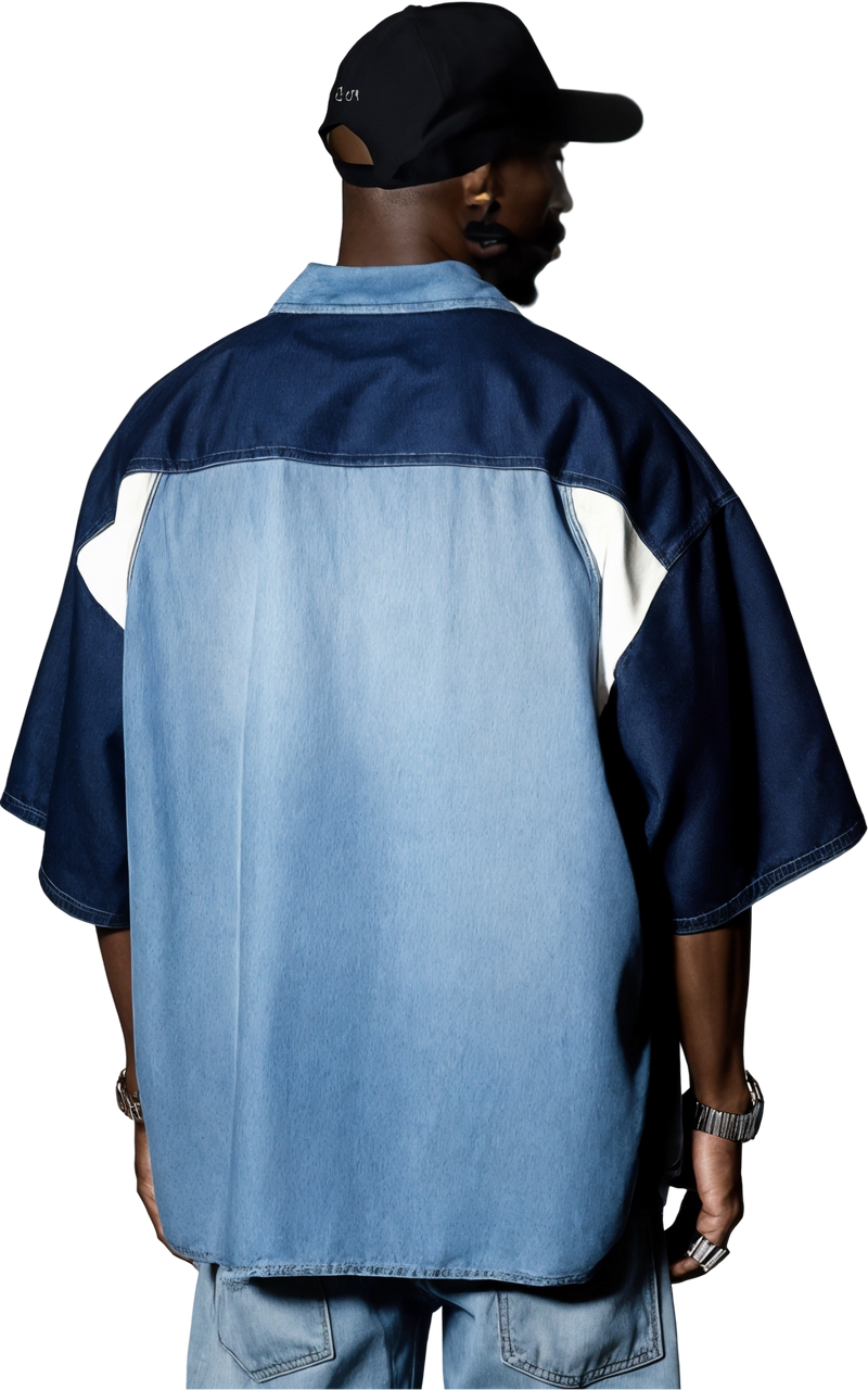 Fresh Prince Denim Shirt – a bold 1990s patchwork button-up in mixed washes, echoing hip-hop’s golden age and the vibrant streetwear seen on TV legends.