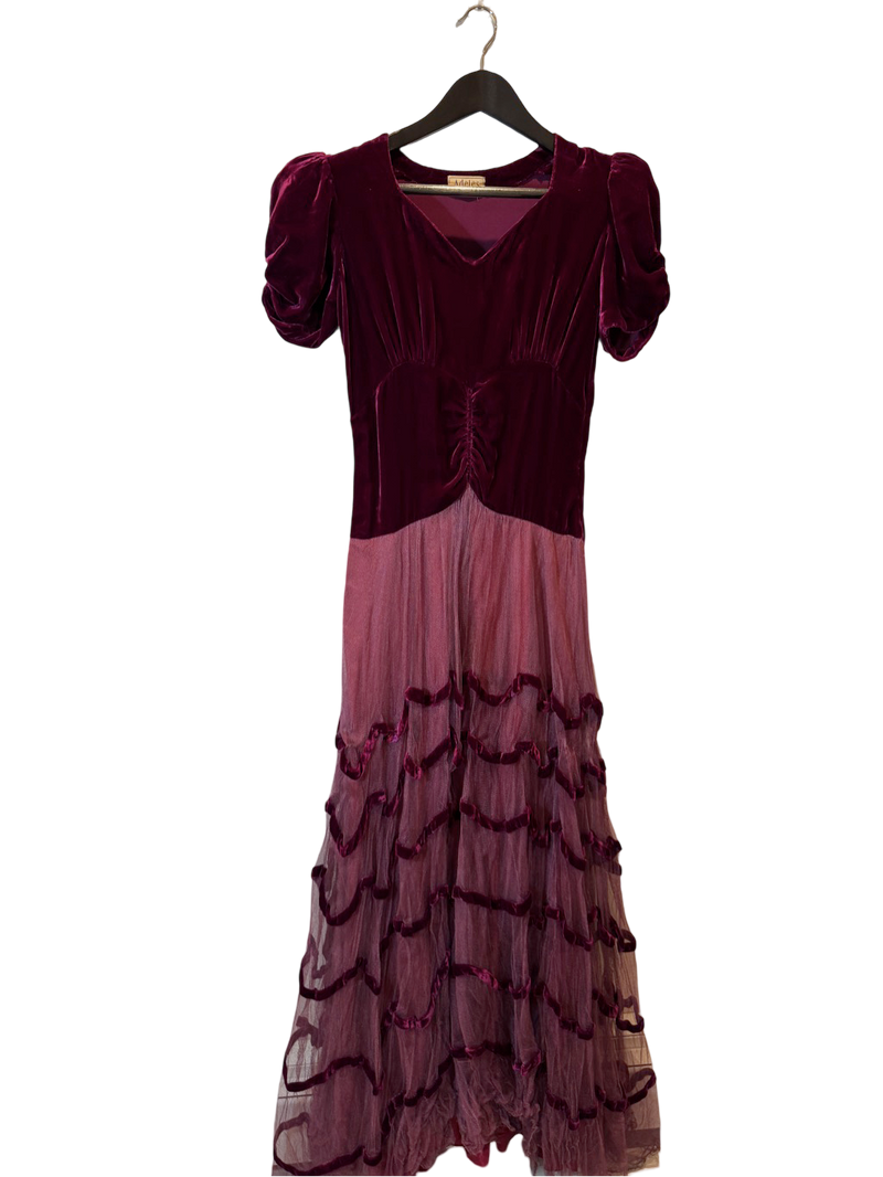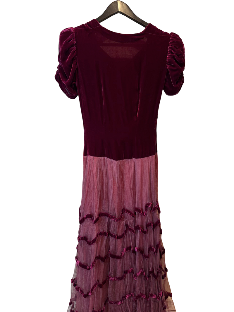 Likely silk-velvet bodice with nylon or rayon mesh skirt. Sourced and revived in the USA.