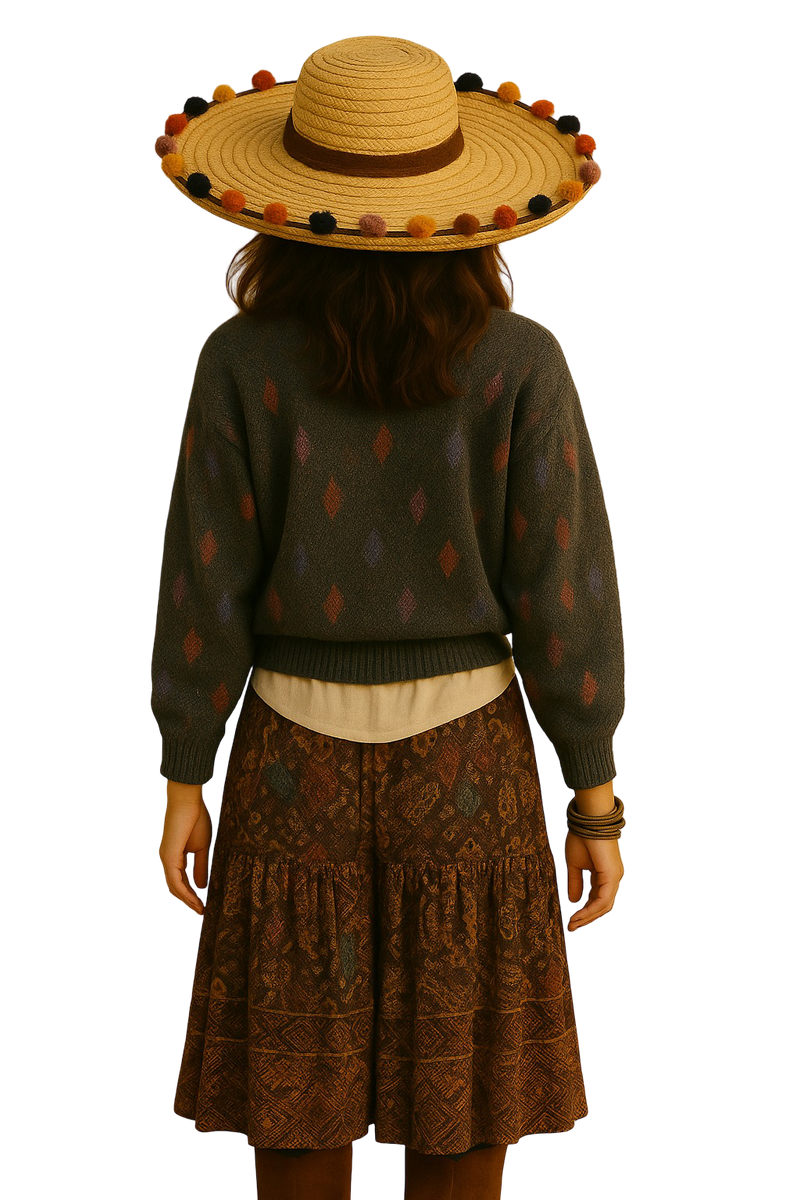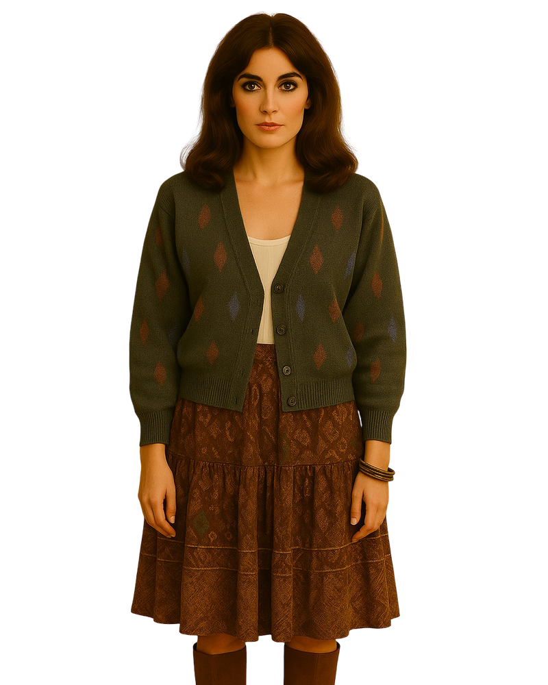 Desert Loom Cardigan – an olive knit with hand-loomed diamond motifs in desert rose and dusk blue, this cropped cardigan brings a grounded softness to any layered ensemble. The kind of piece that feels like it’s always been yours.