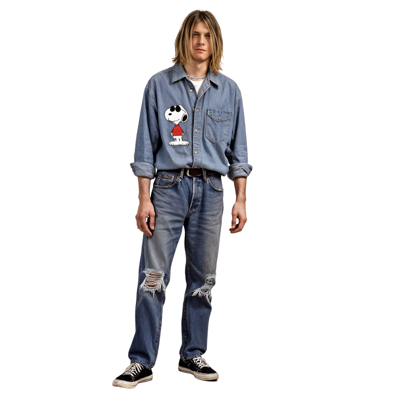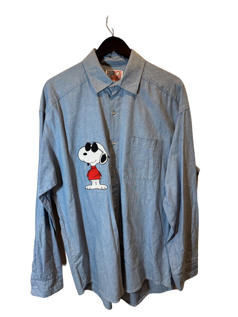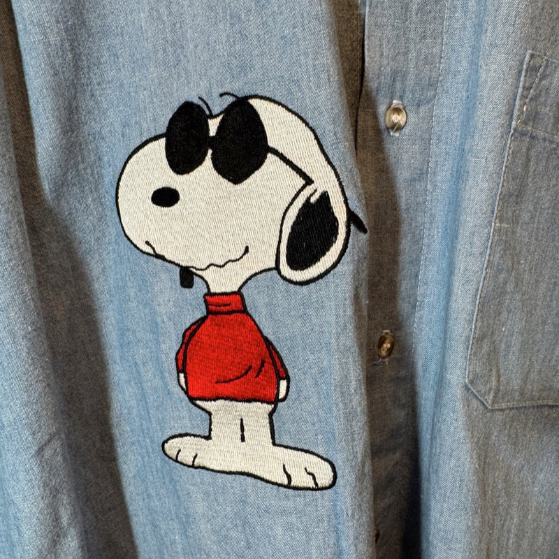 Joe Cool Denim Shirt – a relaxed 1990s button-down featuring Snoopy’s alter ego “Joe Cool,” capturing the grunge era’s ironic embrace of pop nostalgia.