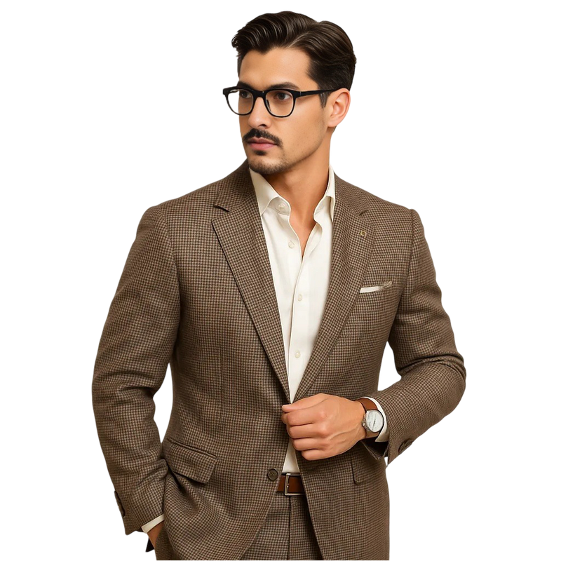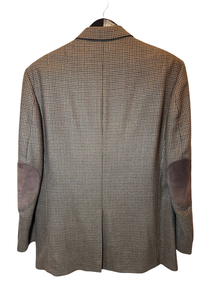 1960s Oxford Houndstooth Blazer – a distinguished wool blazer with classic elbow patches, embodying the intellectual charm of old-money scholars and country estate weekends.