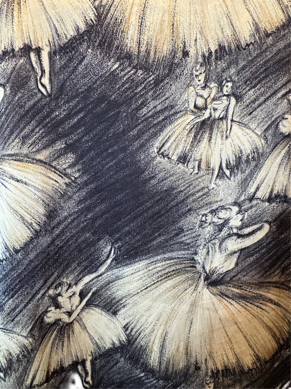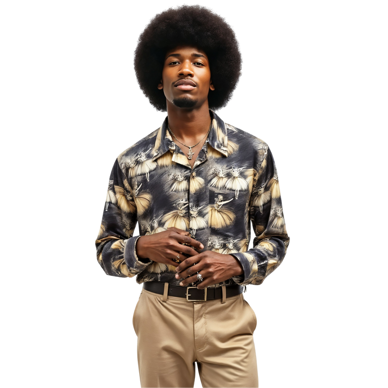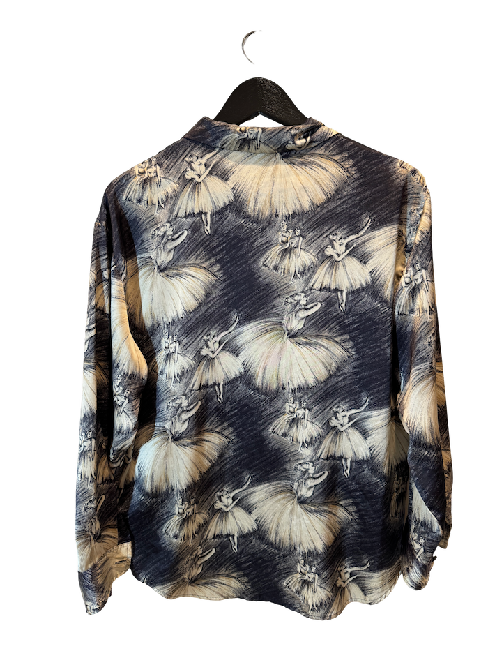Tulle Dream Button-Down – this silky navy shirt features a ghostly ballerina print, a moody moonlit visual straight from an Italo-disco hallucination.
