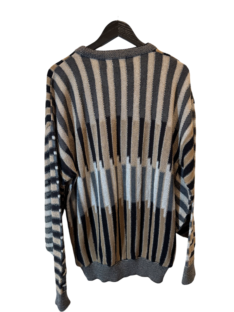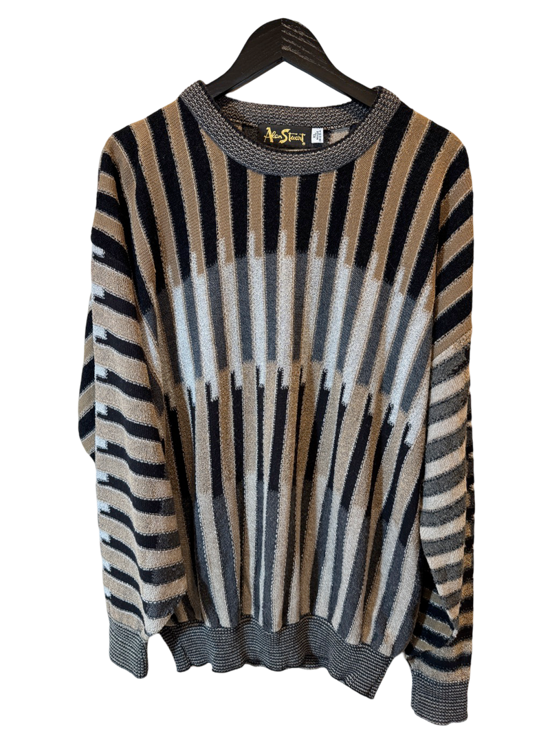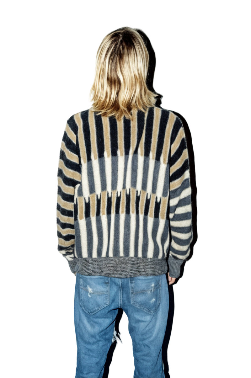 MTV Static Sweater – a hypnotic 1990s knit pullover with glitchy vertical lines, echoing the analog chaos of late-night cable and underground zine art.