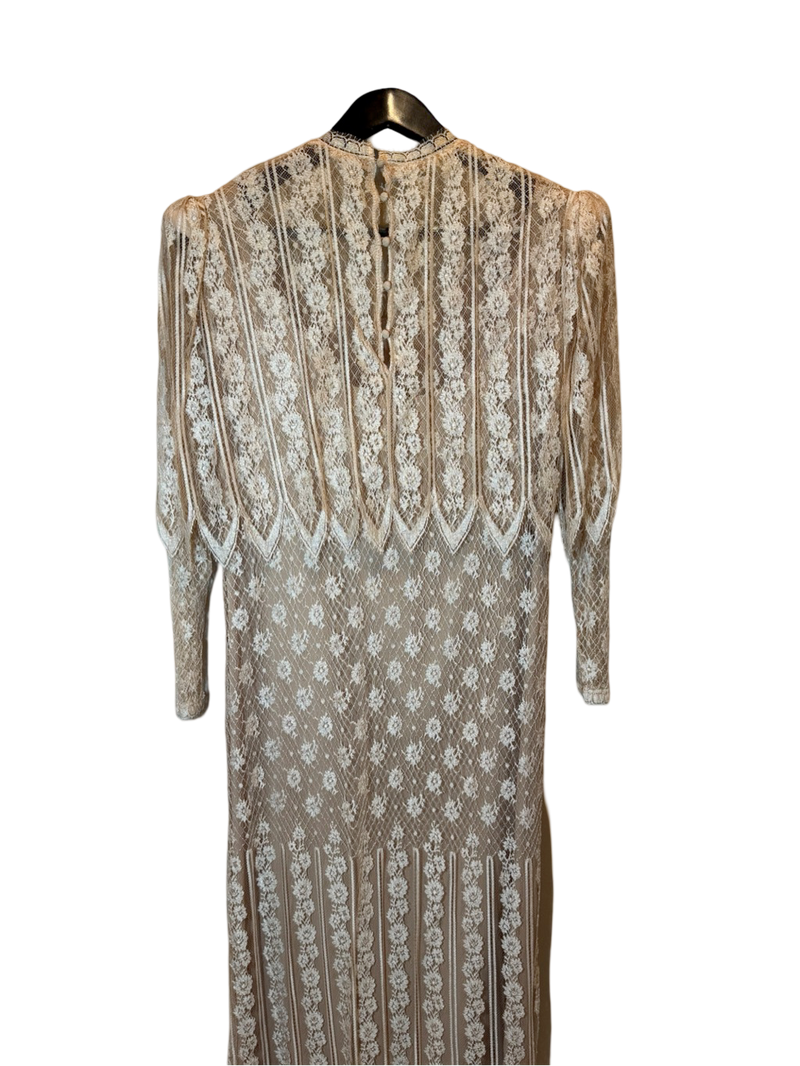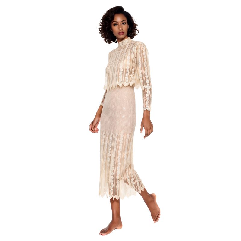 1960s Cabaret Lace Dress – A sheer lace dress inspired by the bold, captivating allure of the cabaret and burlesque clubs, effortlessly elegant and daring.