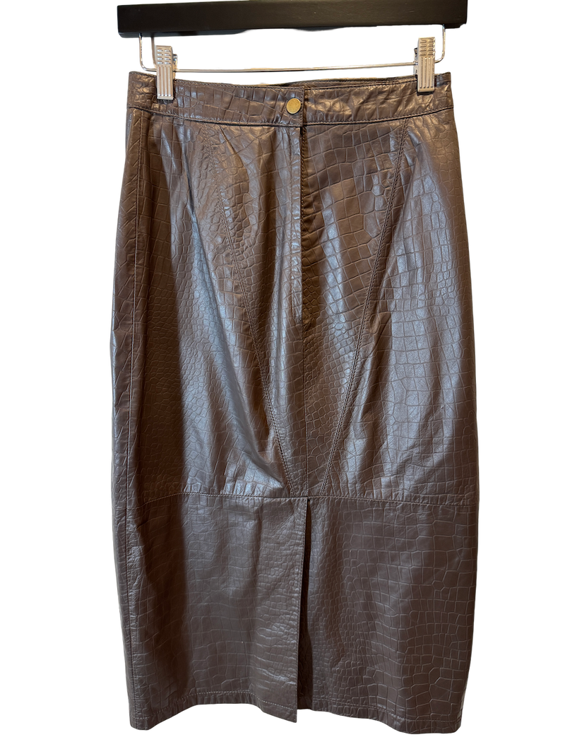 Corporate Croc Pencil Skirt – a high-waisted brown leather stunner embossed in faux crocodile, made for striding into quarterly meetings like it’s Milan Fashion Week.