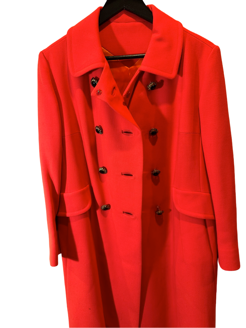 Boardwalk Parade Coat – a structured 1960s double-breasted coat in bold lipstick red, made for seaside strolls, Sunday outings, and neighborhood admiration.