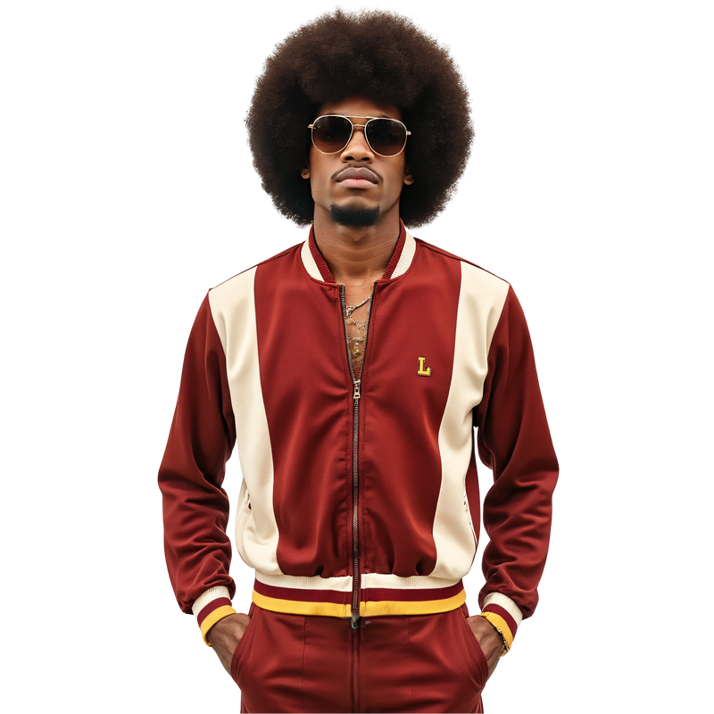 Varsity Pop Track Zip – a maroon and cream zip-up jacket with mustard yellow stripes, pulsing with retro game day energy and rollerskate rink rhythm.