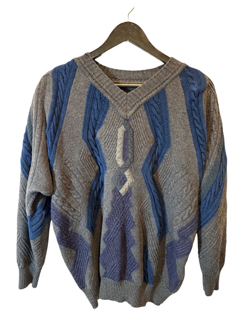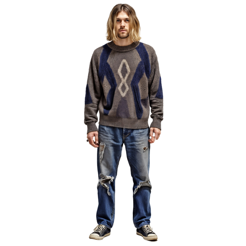 Nickelodeon After Dark Sweater – a textured 1990s pullover with dimensional stitching and bold cables, echoing the surreal graphics of late-night retro TV.
