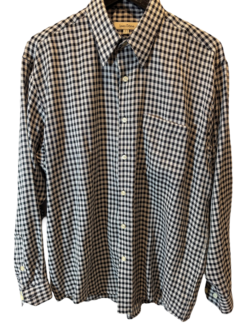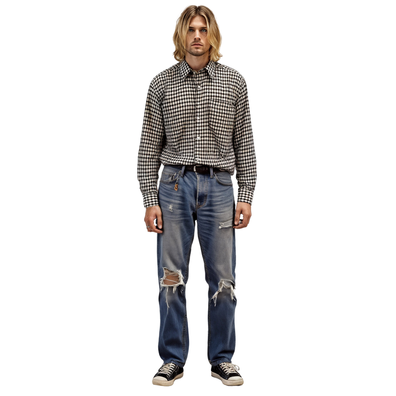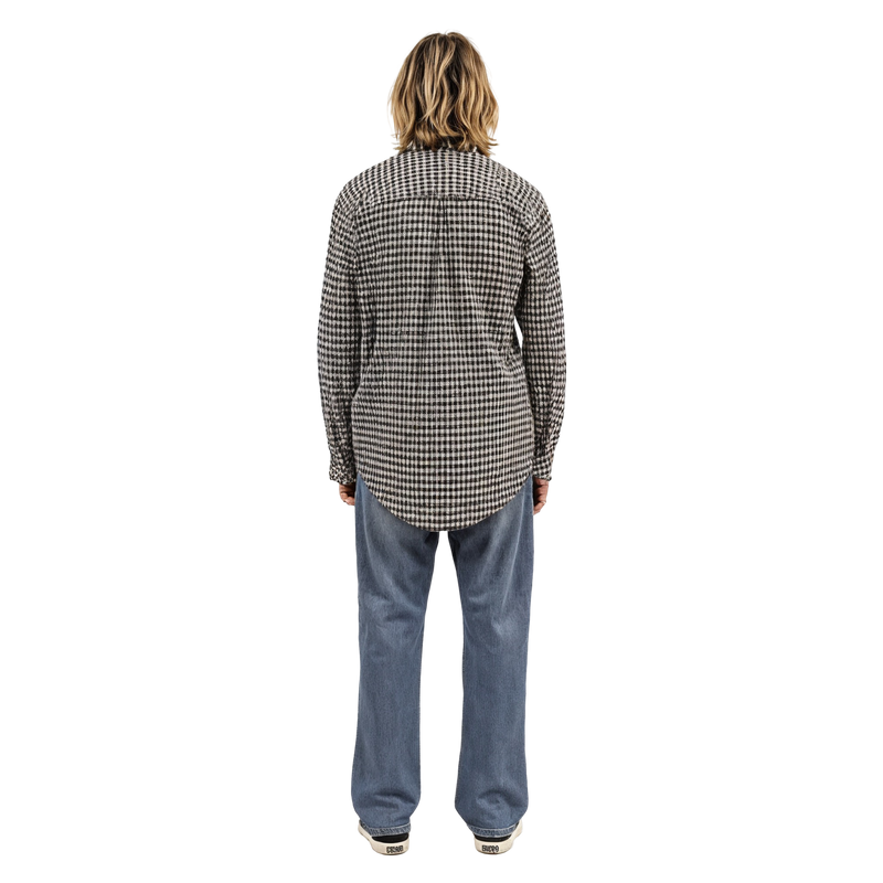 Reality Check Shirt – a 1990s gingham button-down in grayscale tones, echoing the stripped-back aesthetic of DIY zines and flannel-lined jam sessions.