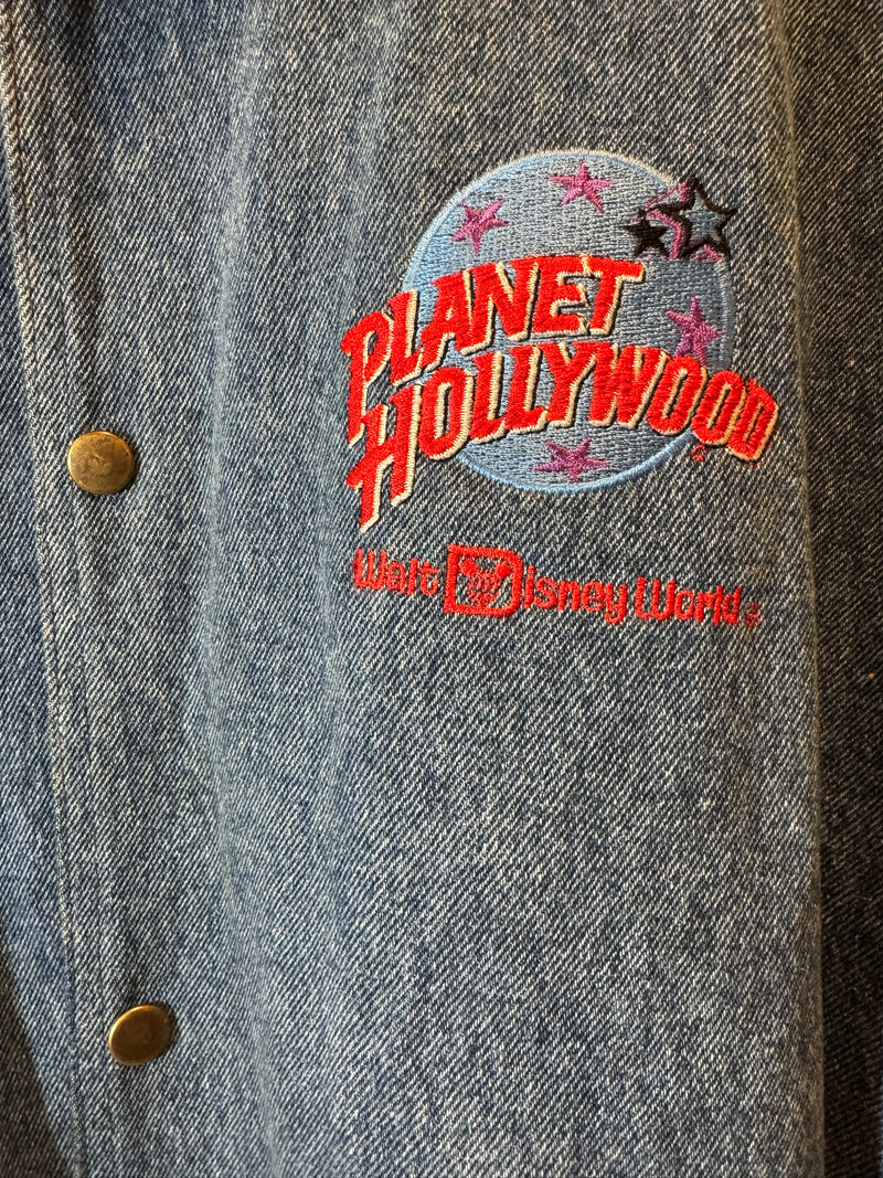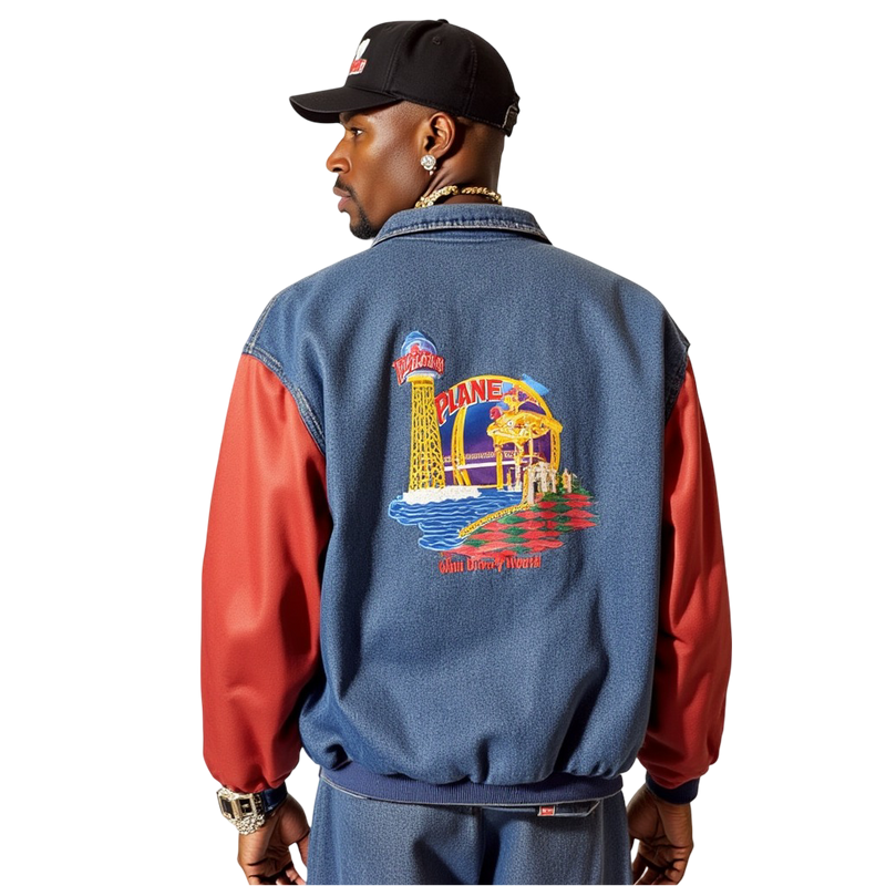 Hollywood Grip Bomber – a heavyweight varsity jacket in denim and faded red faux suede, complete with Planet Hollywood embroidery and big-shoulder energy.