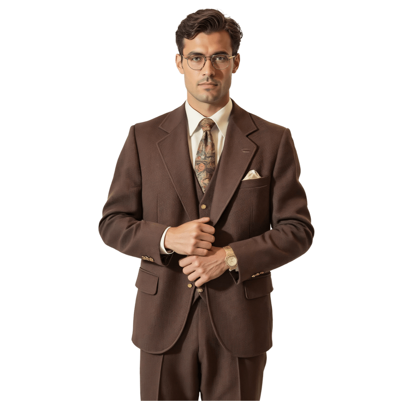 Villa Medici Blazer – this 1960s sport coat is cut in a warm, espresso-brown textured weave, featuring structured lapels, gold-toned buttons, and a paisley satin lining that whispers of opera tickets and whispered conversations in old hotel lounges.