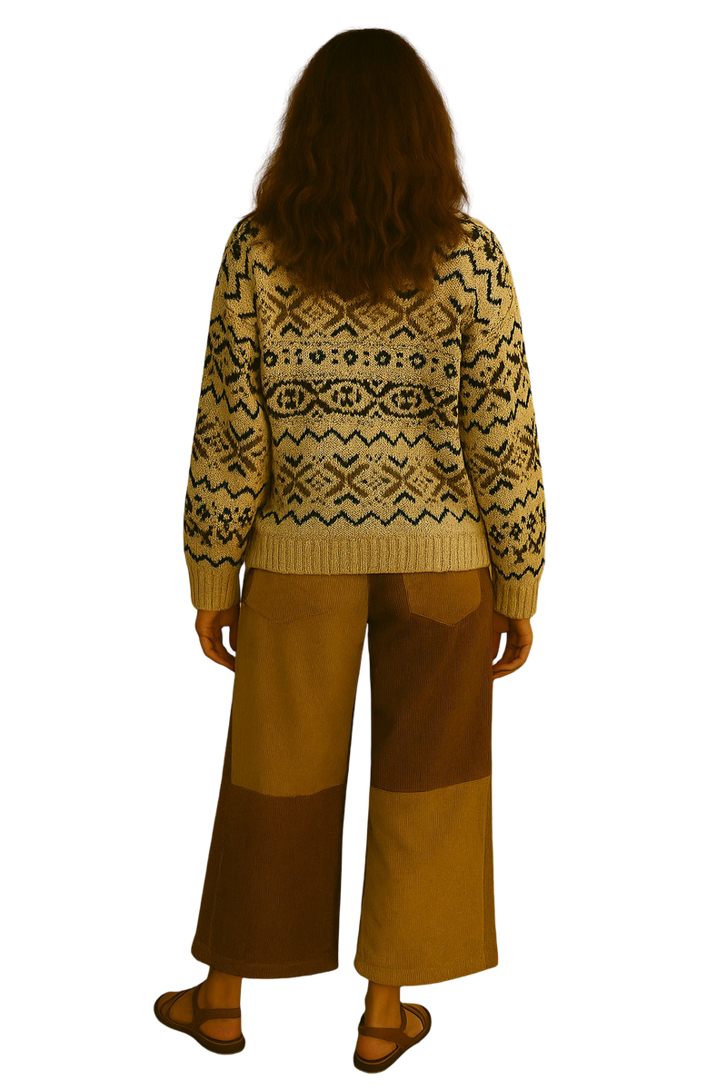 Andes Nomad Knit Pullover – a chunky Fair Isle sweater in earth-toned neutrals, made for golden-hour hikes, market wandering in Marrakesh, and fireside poetry readings. Timeless, soft, and perfectly oversized with vintage texture and pattern rhythm.