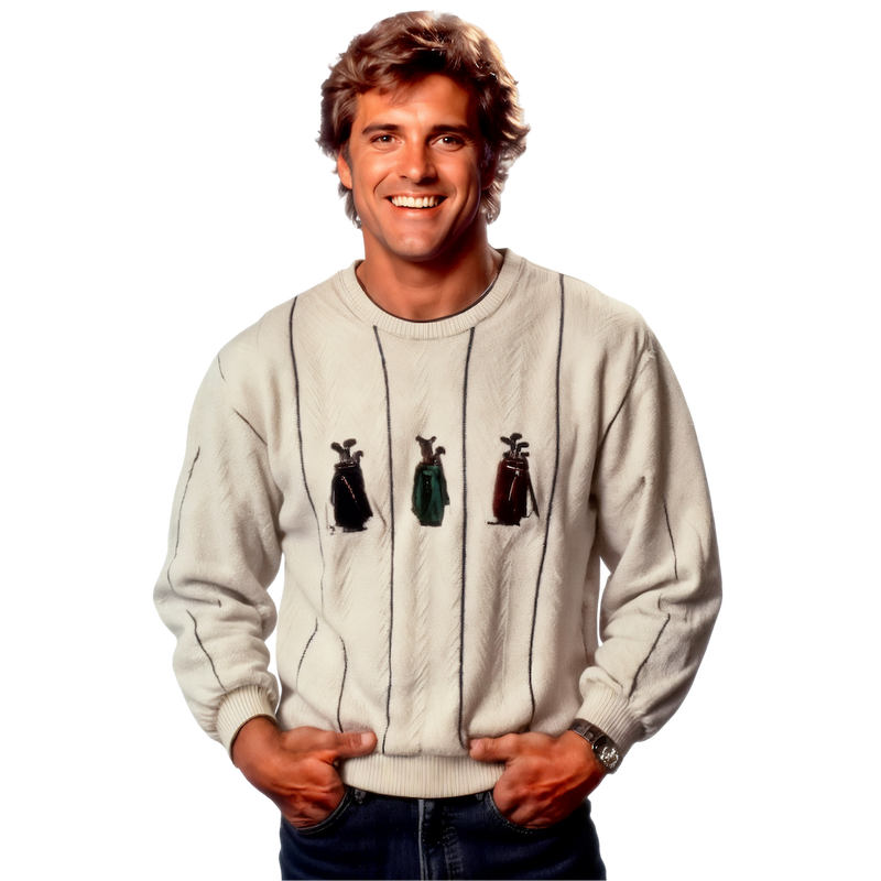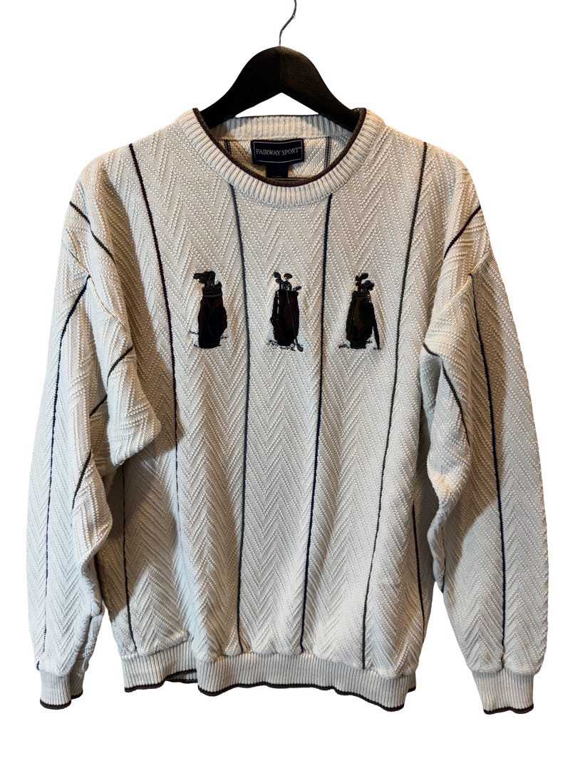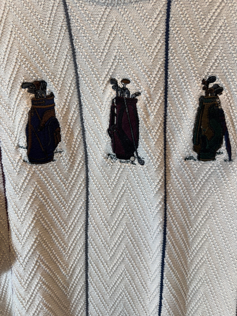 Langley Golf Club Crew – this Fairway Sport knit sweater, with textured chevron weave and embroidered golf bags, is as country club as it gets. Ideal for 10th-hole martinis or barstool bragging after a close match.