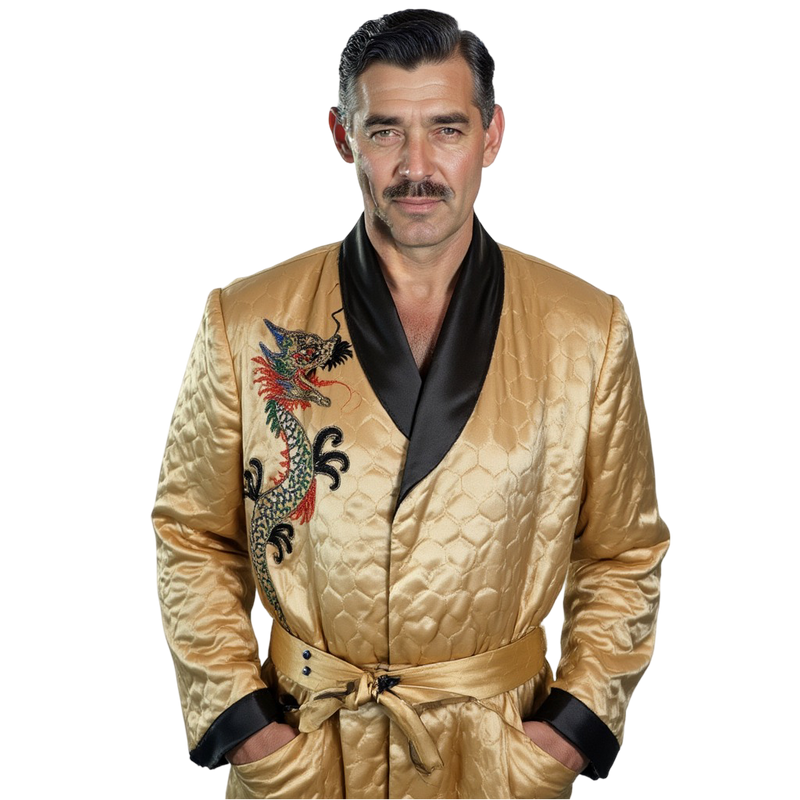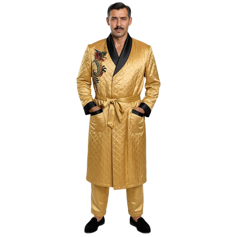 A quilted golden satin wrap embroidered with a dragon, made for mornings that start with strong coffee and end in handwritten scripts.