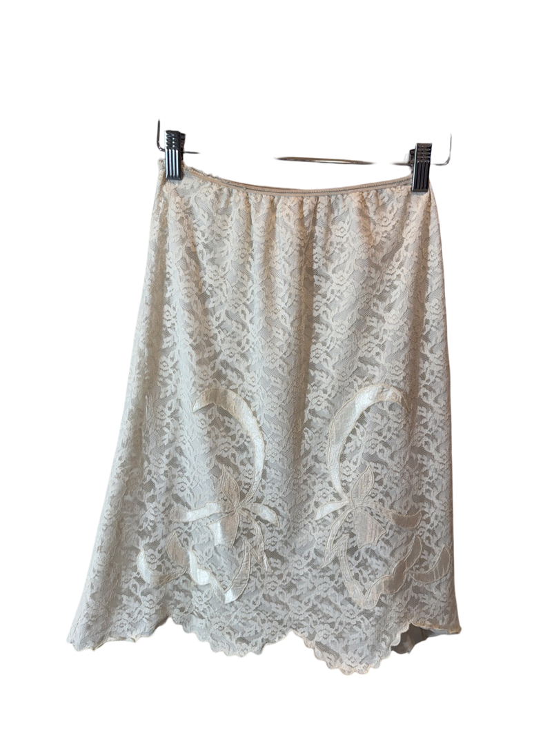 Likely nylon lace with satin appliqué. Sourced and revived in the USA.