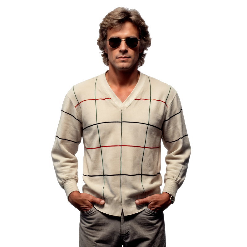 Palm Springs Check-In Cardigan – a lightweight knit with bold gridline striping, ideal for Malibu brunches, casting calls, or just cruising Sunset in your soft-top.