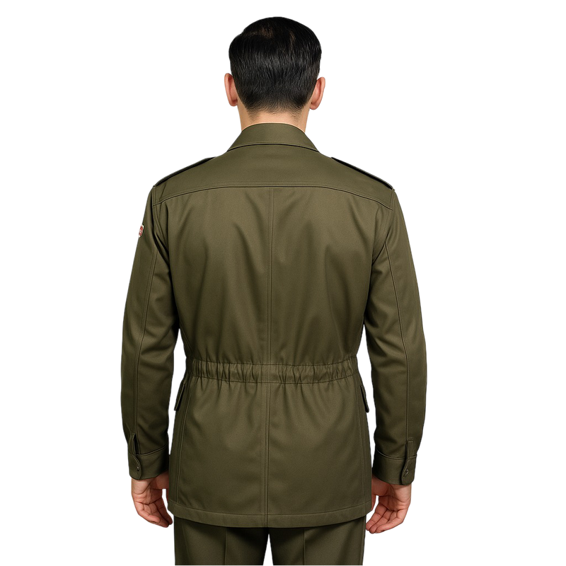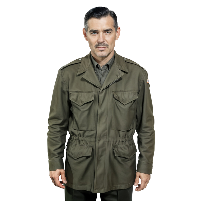A utility green cotton field coat with action-ready tailoring, perfect for directing traffic on a studio backlot or managing location logistics with a cigar in hand.