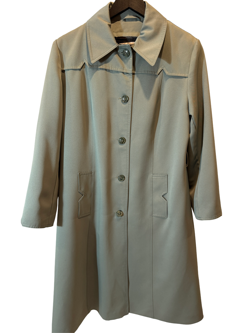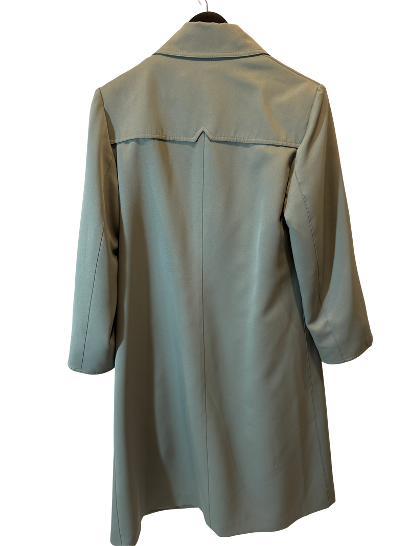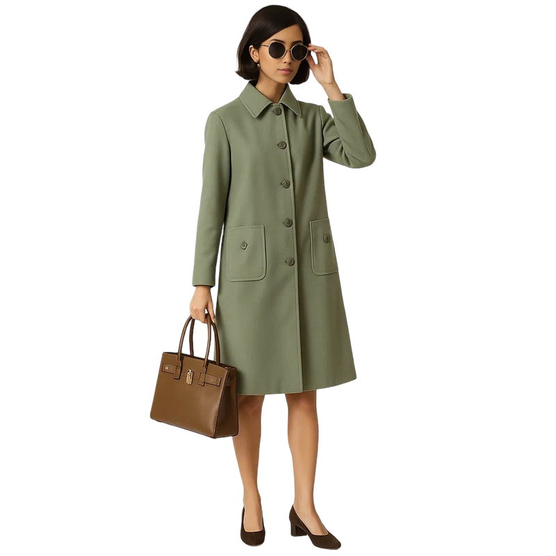 Via Condotti Wool Coat – a refined 1970s button-front coat in sage green wool, tailored with sharp collar lines and flap pockets, perfect for cool strolls from Roman cafés to gallery courtyards.